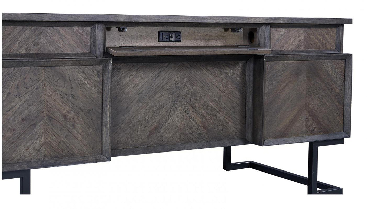 About this Collection: Offering a relaxed contemporary look from the complex organic finish to the contrasting metal accents and hardware. Functional features such as built-in AC & USB outlets, hidden compartments, locking file drawers, and drop front keyboard drawers make this an easy choice for your workspaces.
