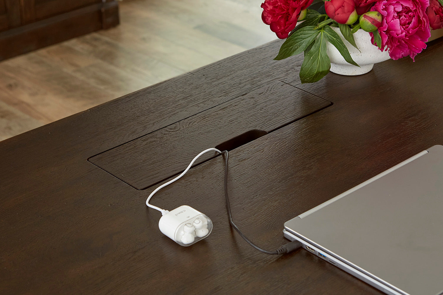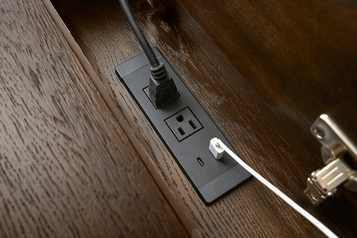 AC/USB outlets,Drop Front Keyboard Drawer,Removable Dividers,Hidden Storage,Locking File Drawers,Cord Management,Dovetail Joinery,Full Extension, Steel Ball Bearing Drawer Slides