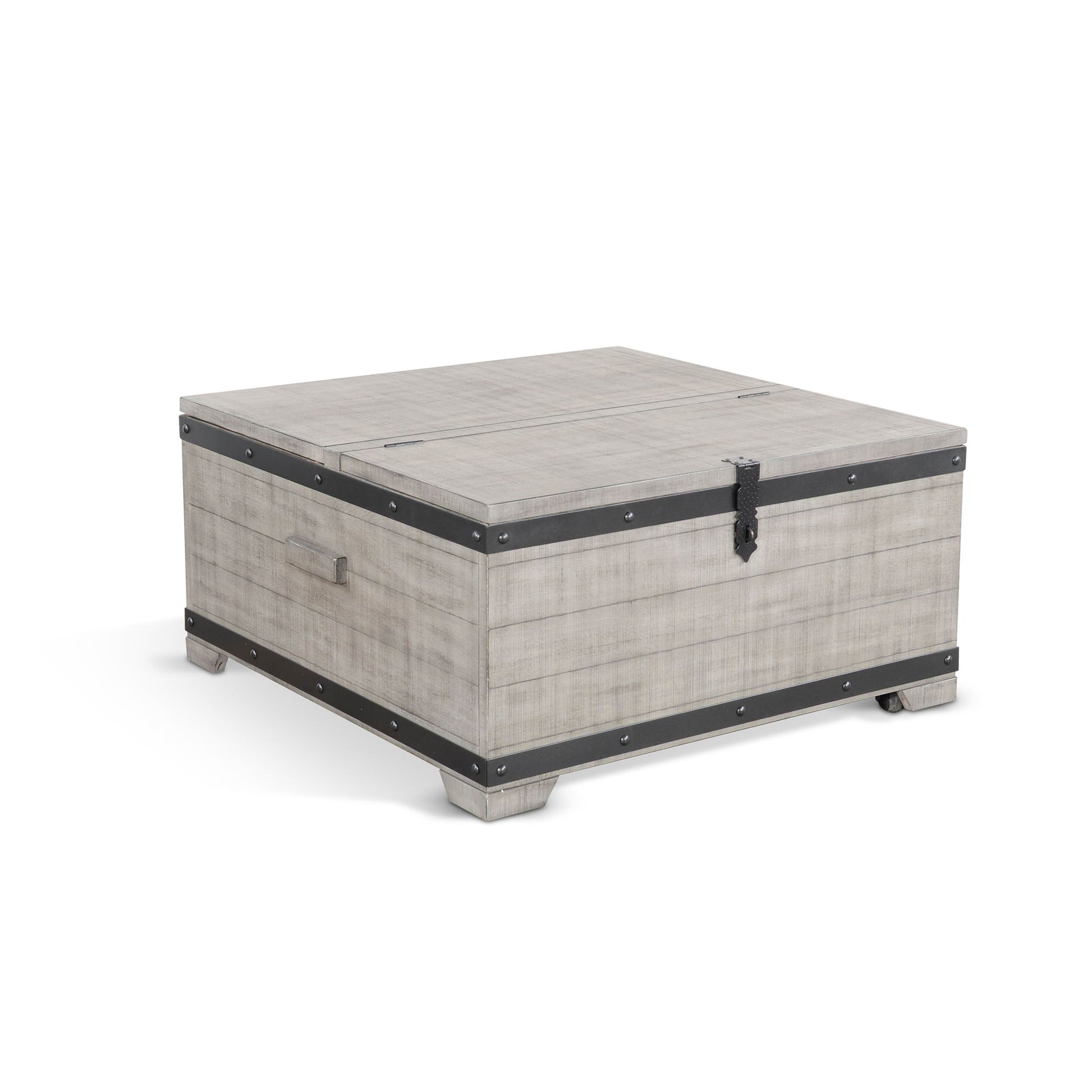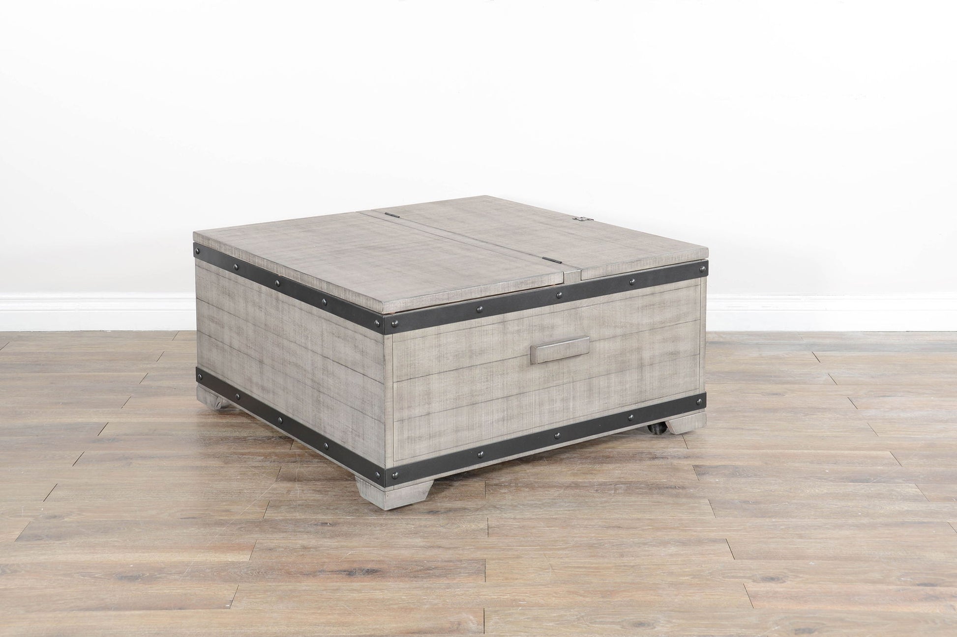 Introducing the Alpine Gray Storage Coffee Table, a versatile and stylish addition to your living space that seamlessly combines form and function. Crafted with care, this coffee table features distressed mahogany with slated panel sides, exuding a rustic charm that adds character to any room. The inclusion of metal details provides an industrial touch, elevating the overall aesthetic with a hint of modern edge. Beyond its captivating design, this storage coffee table is designed to enhance organization, offering a spacious interior for stowing away essentials while maintaining a clutter-free surface.