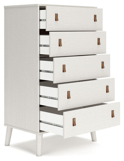 Dare to take minimalism to the max. This chest of drawers has an air of sleek simplicity thanks to its painted finish with subtle replicated wood grain. Magnificently mod splay legs are a compelling complement to the streamlined design. And with two sets of faux leather drawer pulls that allow you to customize the chest to suit your space, there's no doubt about it: This contemporary piece is sure to become a classic.