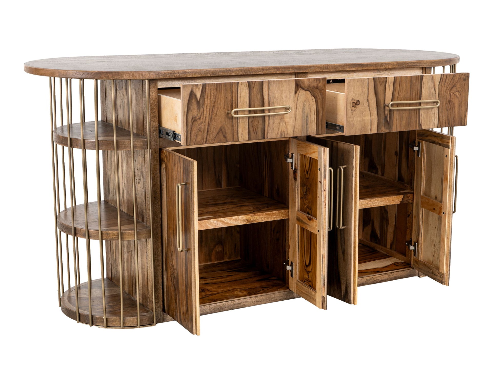2 Drawer & 4 Door, 6 Shelf Kitchen Island. Our Balam collection is handcrafted from mango and teak wood. The Balam Kitchen Island is designed for culinary enthusiasts who appreciate both aesthetics and practicality. Six open shelves, supported by gold-aged metal bars, serve as a display for your favorite kitchenware and pantry items, while four doors and two deep drawers help keep your kitchen organized. This simple yet elegant collection adds an organic, modern vibe to your space.