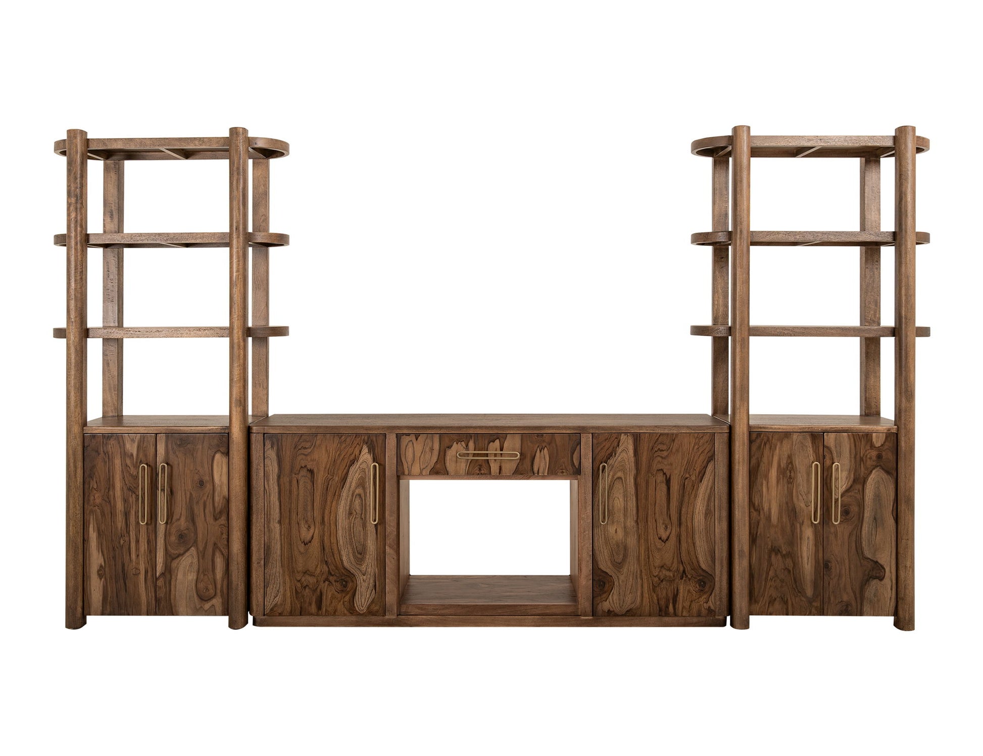 2 Door, 3 Shelf Pier. Our exquisite Balam collection is meticulously handcrafted using high-quality mango and teak wood. This simple yet striking collection is designed to infuse your space with an organic, modern aesthetic. The Pier - Boocakse boasts a unique organic shape, featuring elegantly curved oval shelves at the top and a storage cabinet, adding a touch of sophistication to any room.