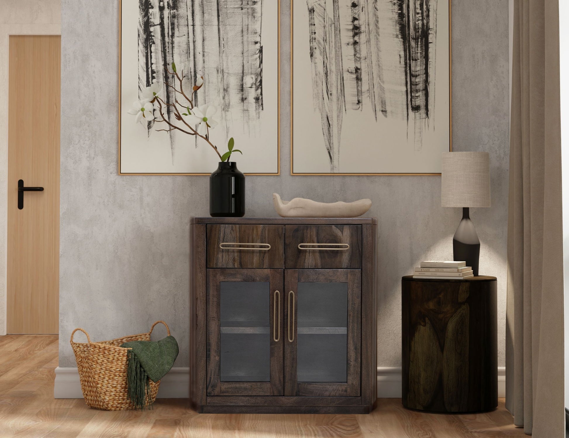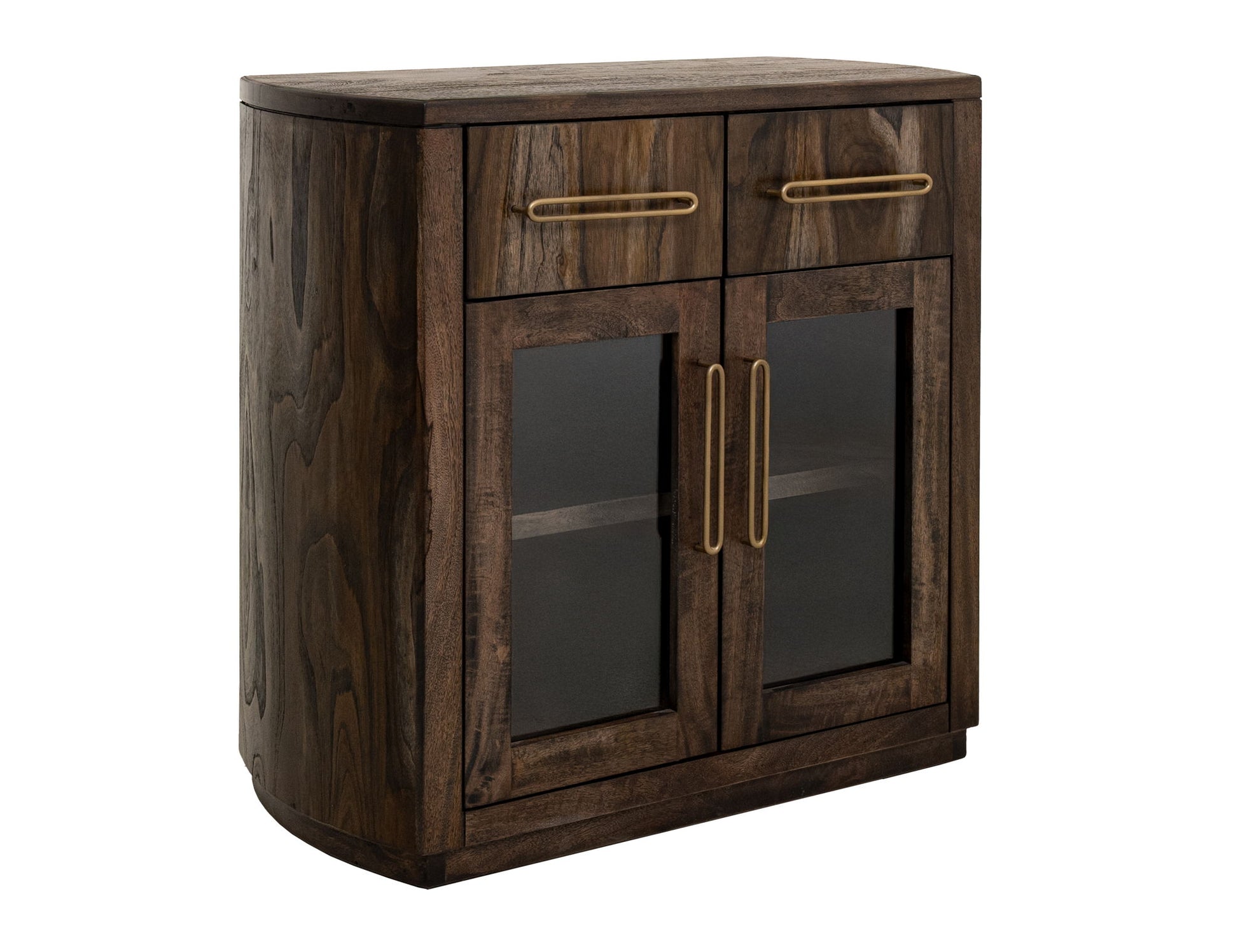 2 Drawer & 2 Glass Door Server. This beautiful Balam Collection, is both stylish and functional. It features two glass-paneled doors, making it perfect for showcasing your cherished items. The collection design combines modern elegance with practicality, making it a versatile addition to any room.