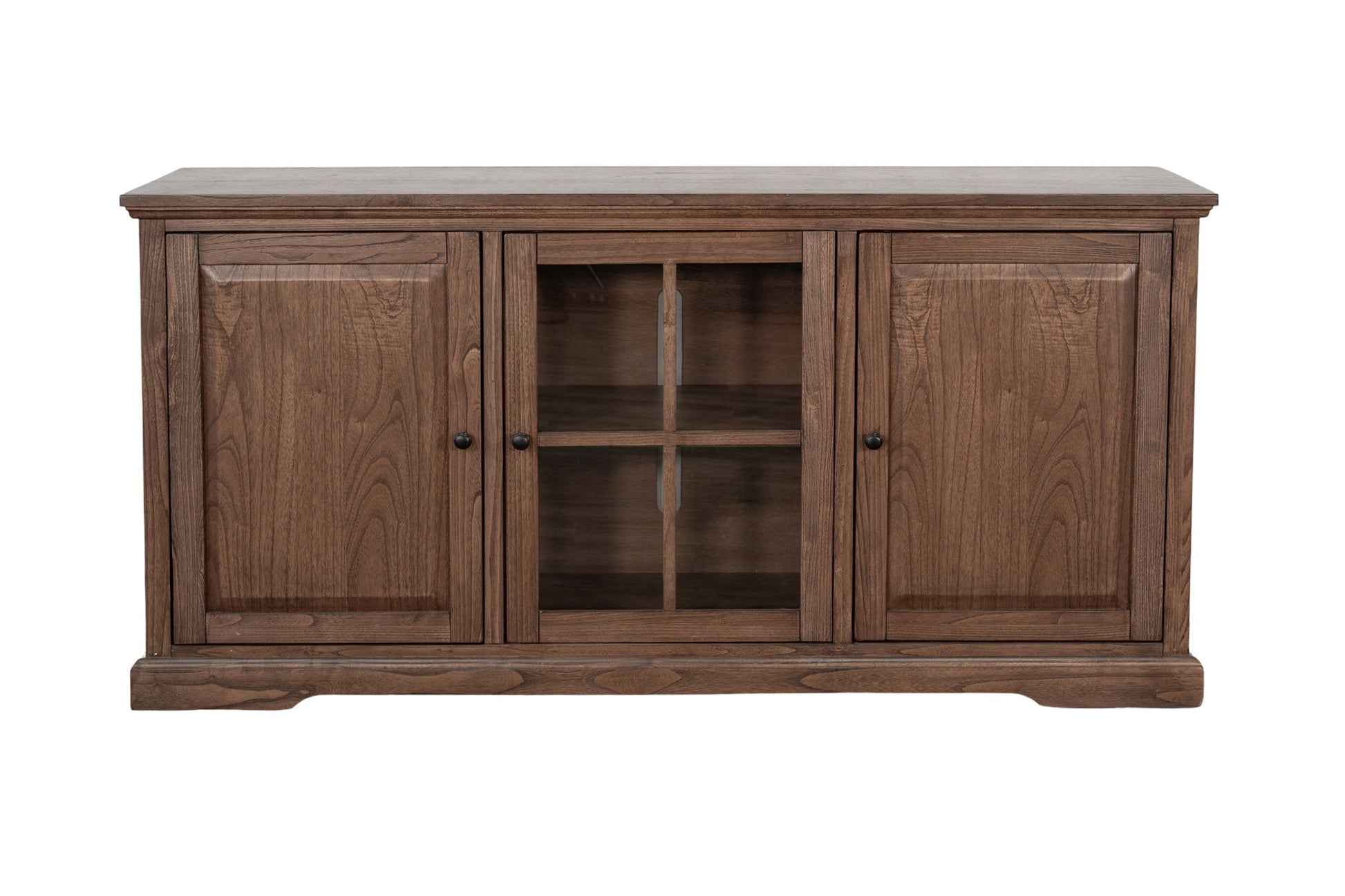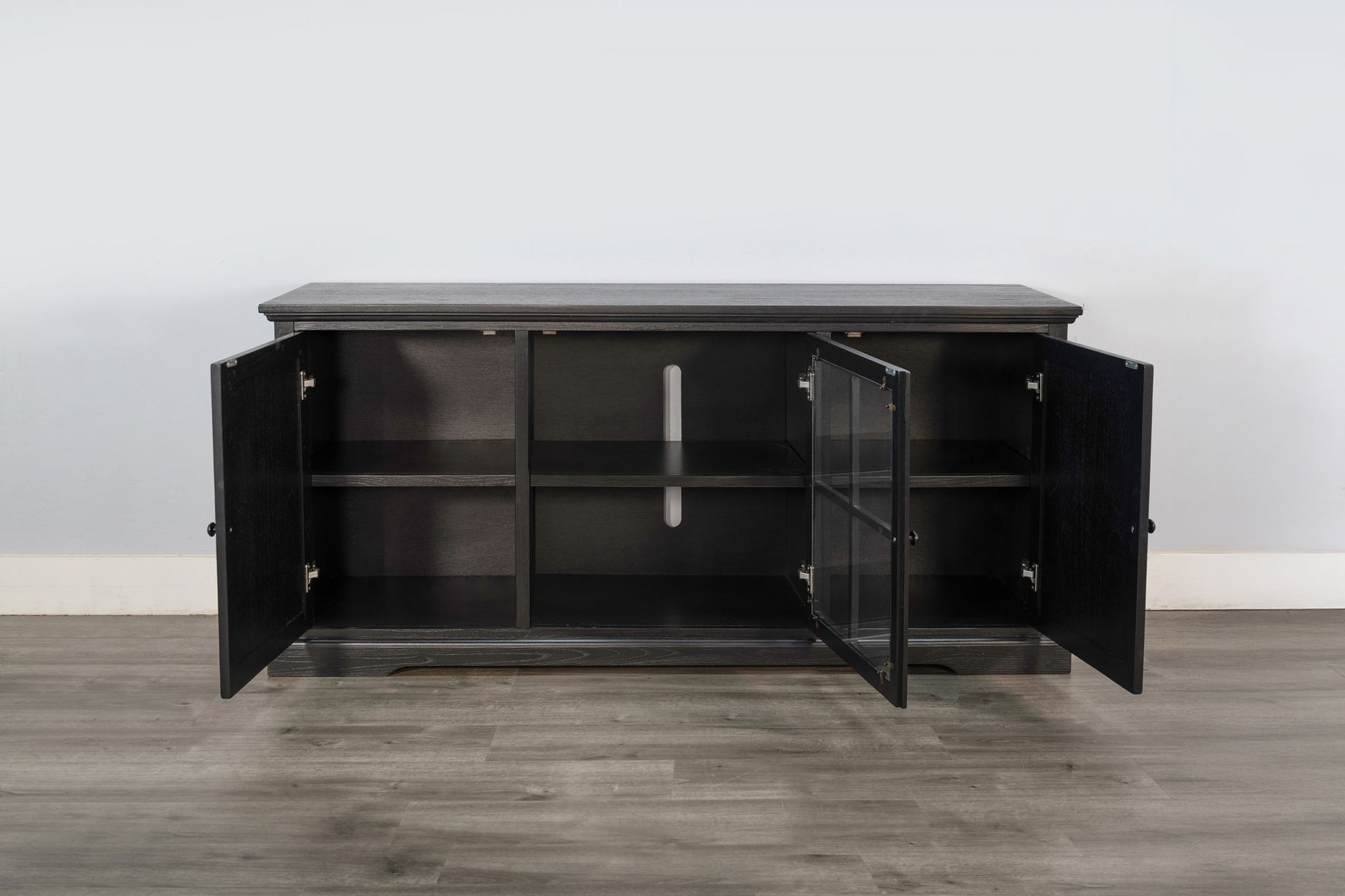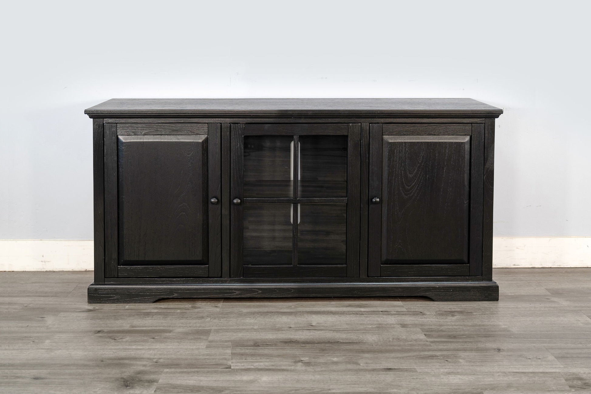 Bring timeless charm and practical storage into your home with this versatile wooden console. Crafted from durable wood with a finish, this piece blends classic design with modern functionality. The two side cabinets feature paneled wood doors for concealed storage, while the center showcases framed glass doors that highlight your favorite décor, media components, or dinnerware. Inside, adjustable shelving provides customizable organization, and the back panel includes a cord management slot to keep wires tidy. Perfect for use as a TV stand, dining sideboard, or entryway console, this piece is as stylish as it is functional.