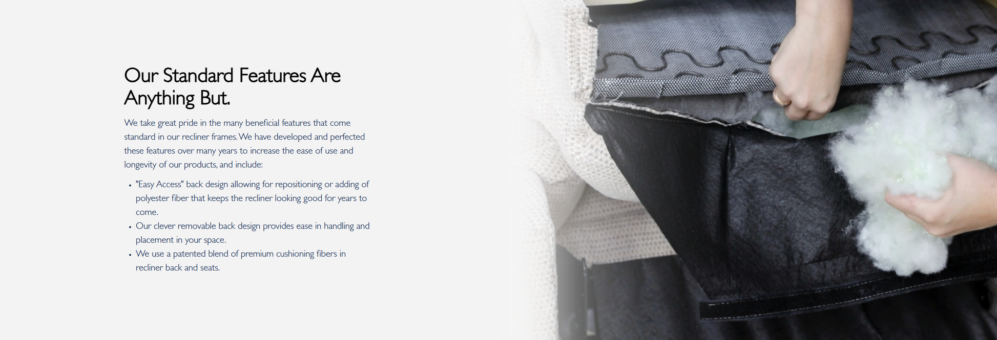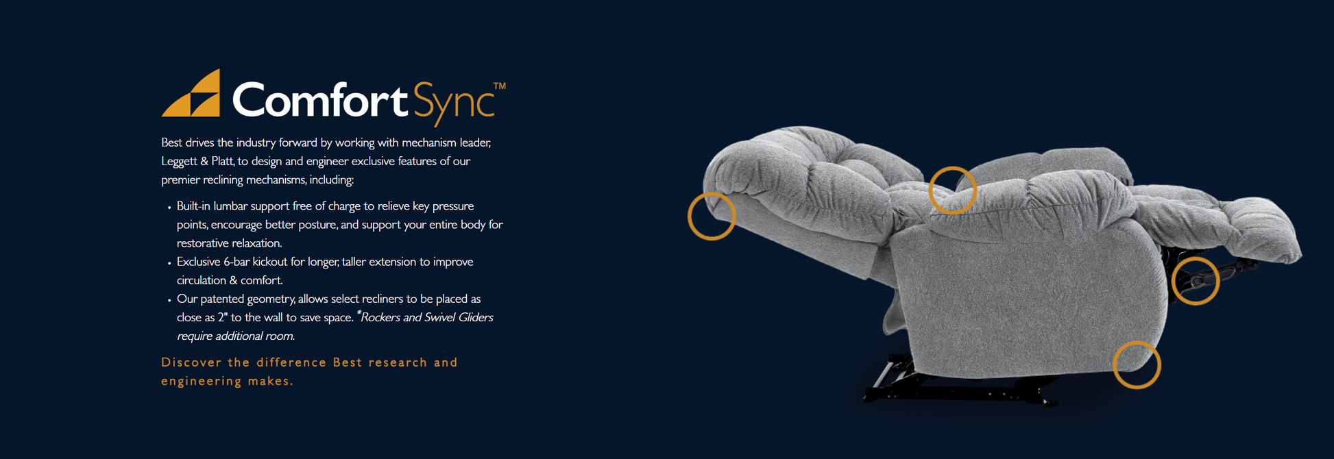 One of Best Home Furnishings most comfortable recliners to date, the overstuffed biscuit back is filled with premium cushioning fibers along with the back, seat, arms and chaise lounge. The removable back gives you easy access to the adjustable lumbar support, plus it adds to the ease in handling and transport. Not only can you customize this in over 700+ fabrics or a diverse offering of genuine leather, but it's available as a Space Saver®, Rocker, Swivel Glider, Power Lift, Power Rocker or Power Space Saver® - both of which can come with a power adjustable headrest option. Deluxe your relaxation with a built in two-way Heat & Massage option - not available with the adjustable headrest.