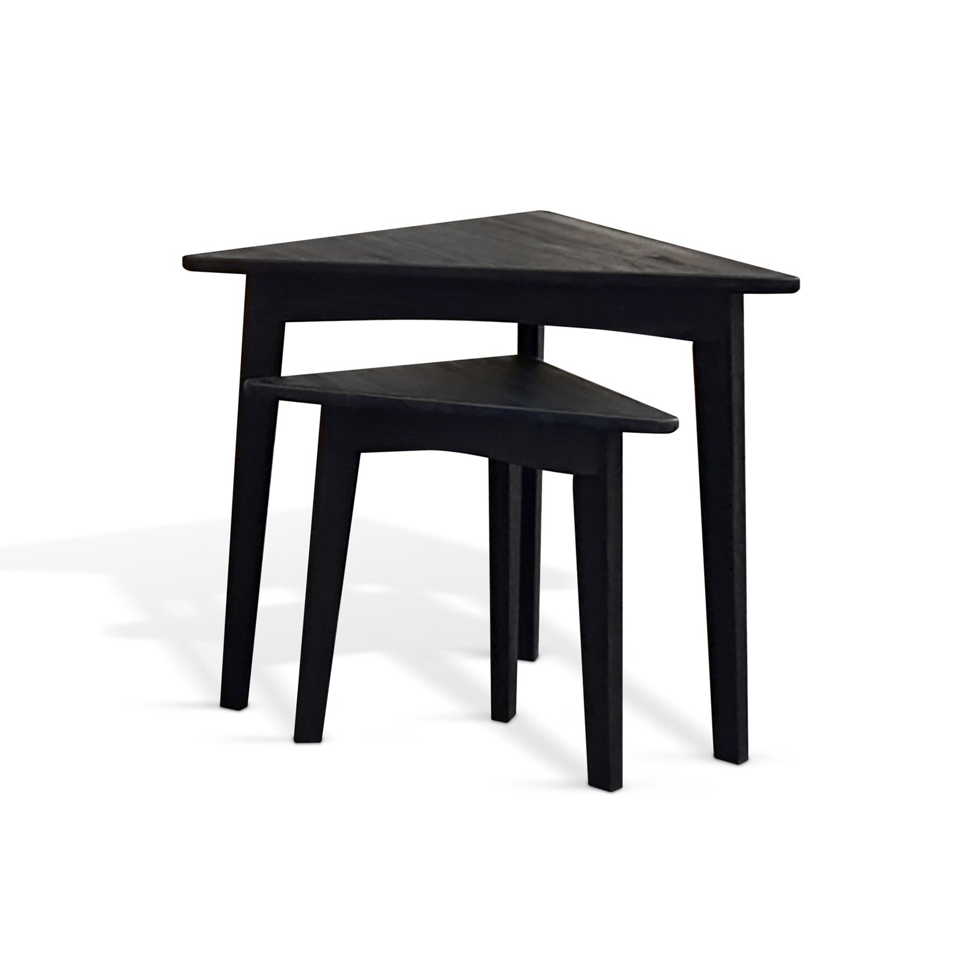 The pair of triangle-shaped end tables presents a distinctive and modern approach to accent furniture. Crafted with precision and contemporary flair, these tables boast a unique triangular design that adds a geometric sophistication to any space. The sleek and smooth surfaces of each table provide an ideal platform for placing drinks, books, or decorative items. Their compact size makes them perfect for fitting into corners or alongside furniture, offering versatility.