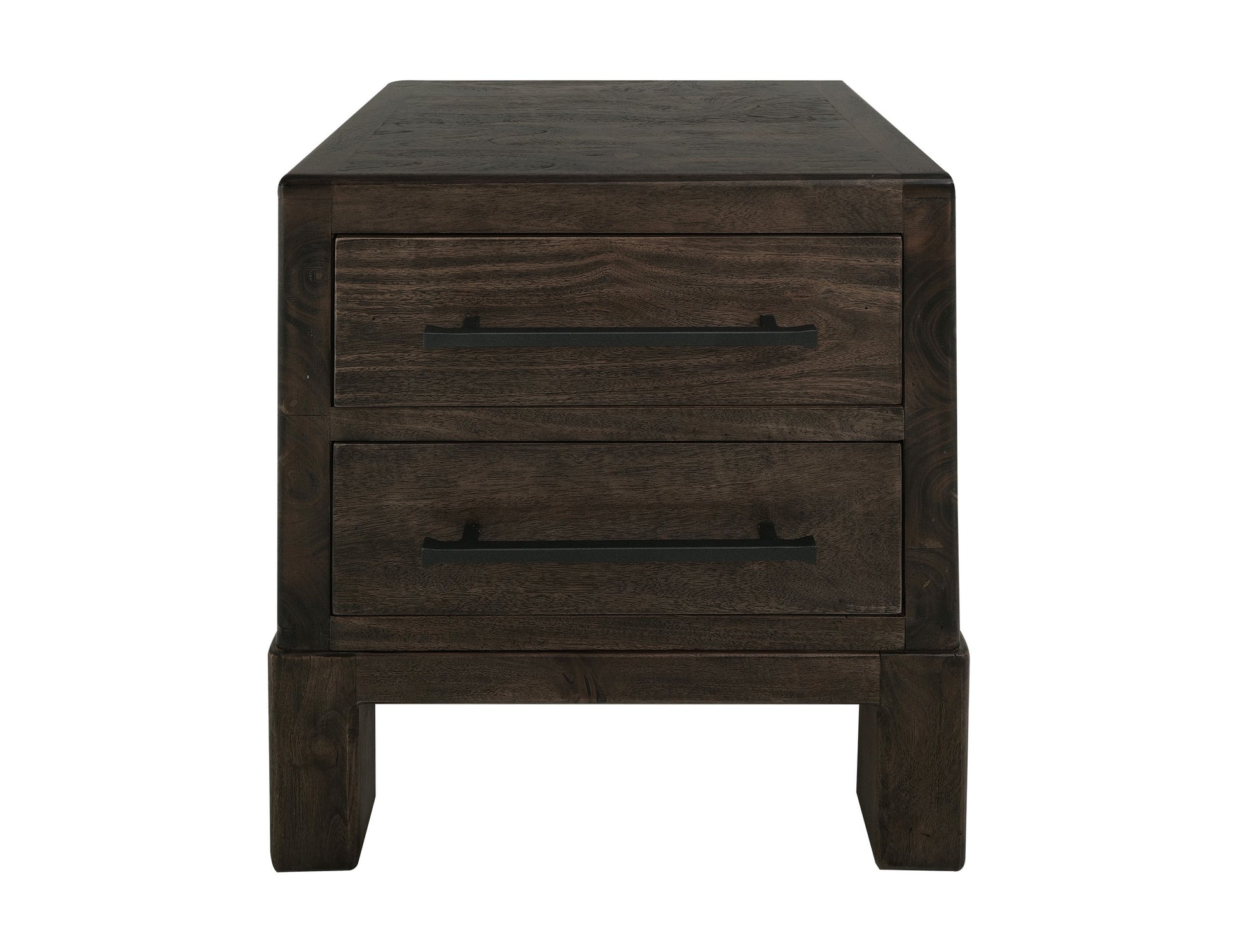 2 Drawer Nightstand. The Merida Collection features an exquisite bedroom set that perfectly fuses sustainability and design, embodying eclectic modern style. Made from environmentally friendly mango and melina wood, it combines beauty and functionality to enhance your space. The black finish highlights the natural elegance of the wood, creating a serene and inviting atmosphere. The nightstand features a minimalist design characterized by clean lines and a square shape; it not only offers practical storage solutions but also enhances the aesthetic appeal of your bedroom with its timeless charm.