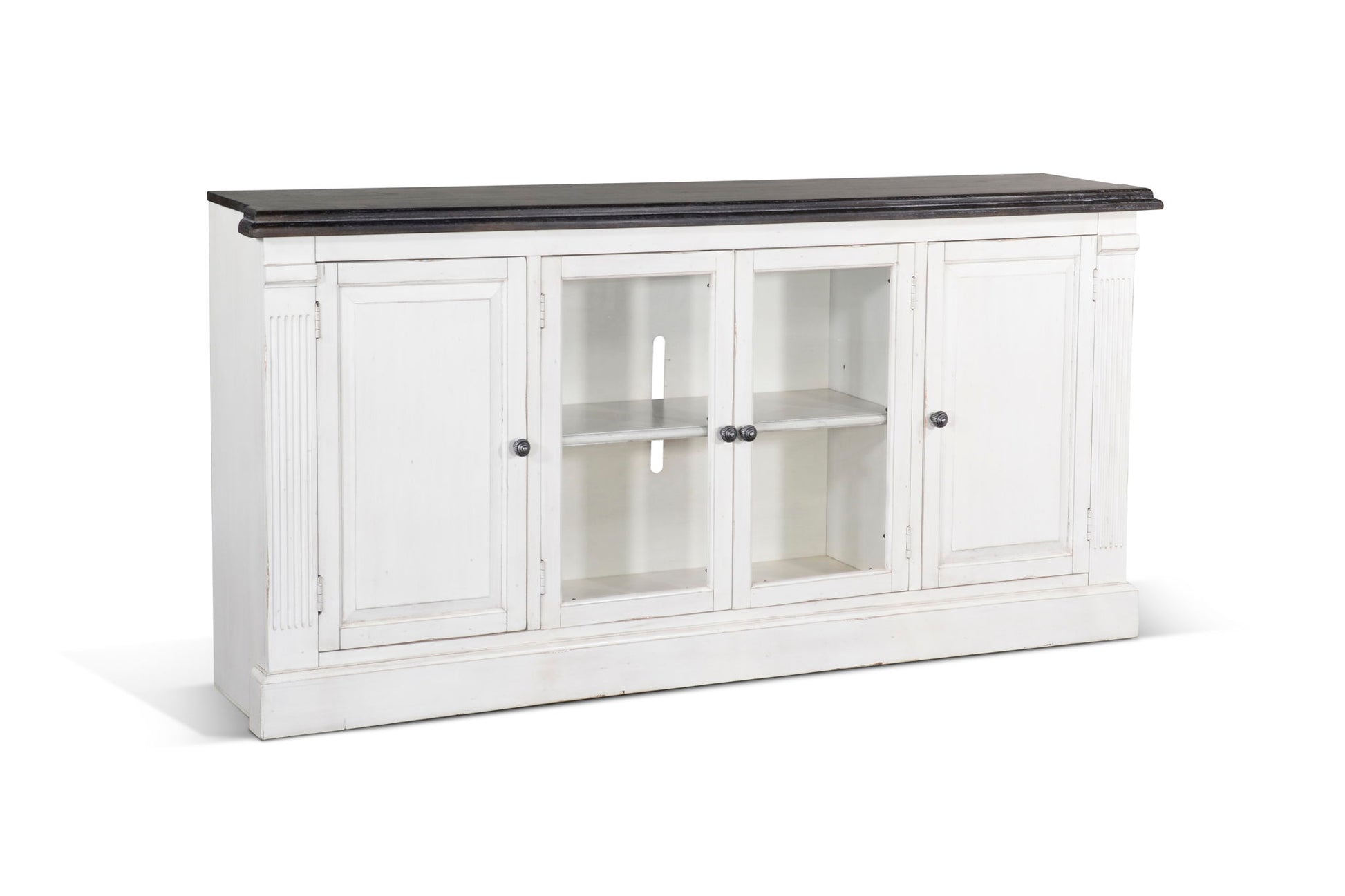 The Carriage House TV Console is sure to transform your living space with its traditional moldings and clean lines. With plenty of room for storage and display, including adjustable shelves, this console ensures that you can keep organized and adds an elegant touch to your home.