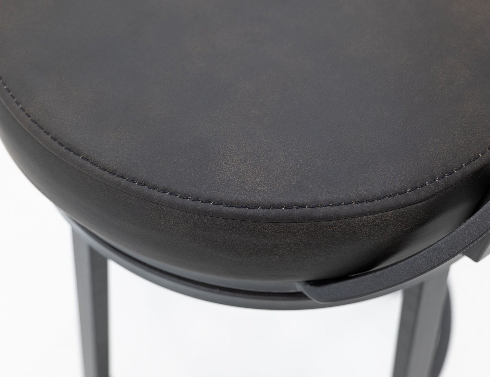 The stool includes a round cushioned seat upholstered in faux leather for added comfort. Its wooden backrest provides a warm, natural touch to the overall design, while horizontal metal bar enhance the modern aesthetic and offer additional support.