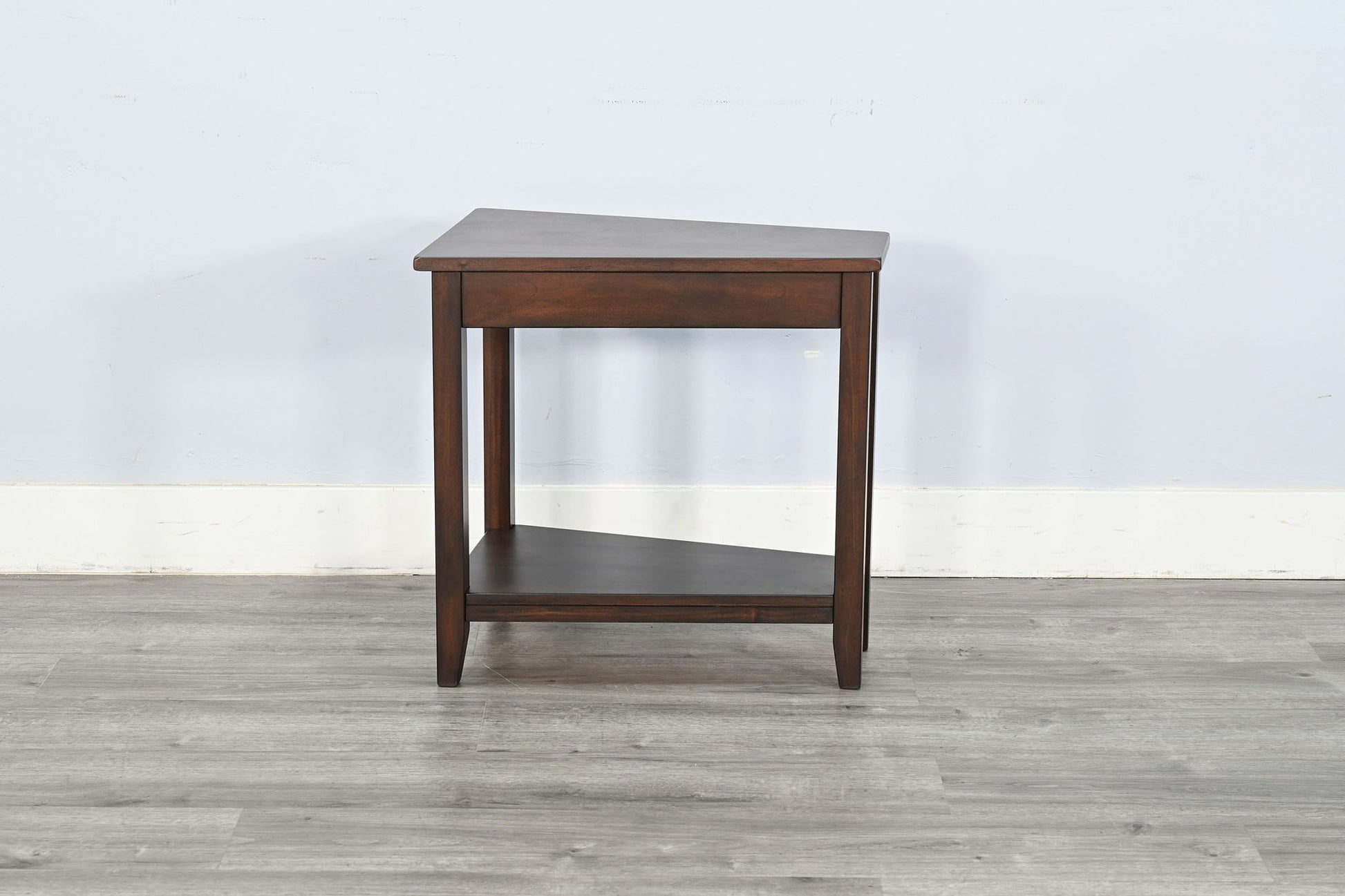 Whether set chairside, next to your sofa or pulled up to your bedside for a distinctive nightstand, this chair side wedge table is an excellent addition to any ensemble. This simple design offers one open lower shelf that is great for accent decor, stacking your go-to novels, or fanning out your favorite magazines.