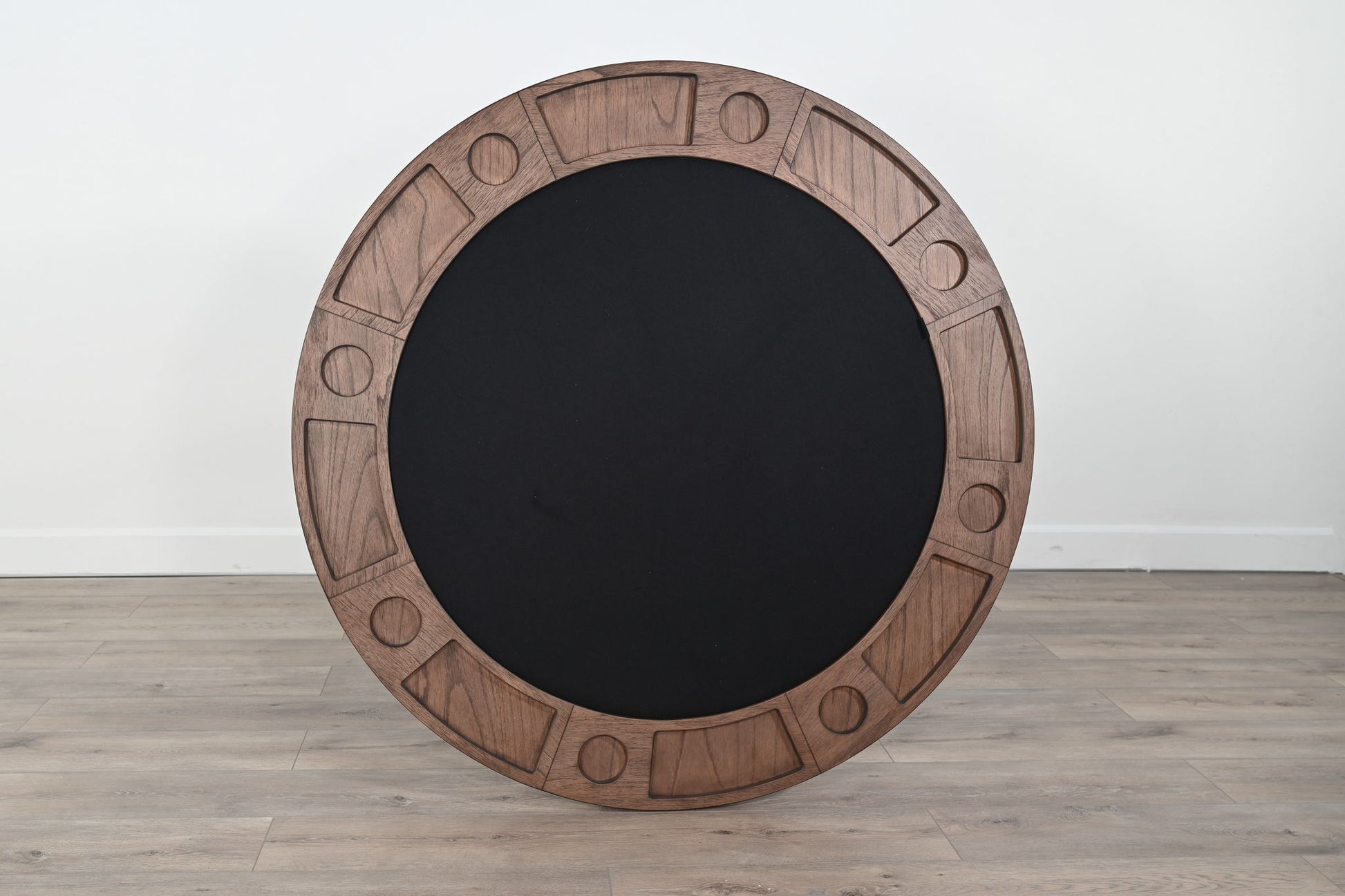 Upgrade your dining and game nights with this versatile round table, thoughtfully designed to transition effortlessly between everyday meals and exciting card-playing evenings. The smooth round top offers a classic dining surface perfect for family dinners, casual coffee chats, and entertaining guests. When it's time for game night, simply rotate and reveal the recessed poker surface featuring individual cup and chip holders to keep every hand organized. Supported by a sturdy pedestal base with reinforced cross-beams, this table delivers lasting stability and a warm, elevated look in any space. A smart all-in-one solution for kitchens, dining rooms, and entertainment areas.