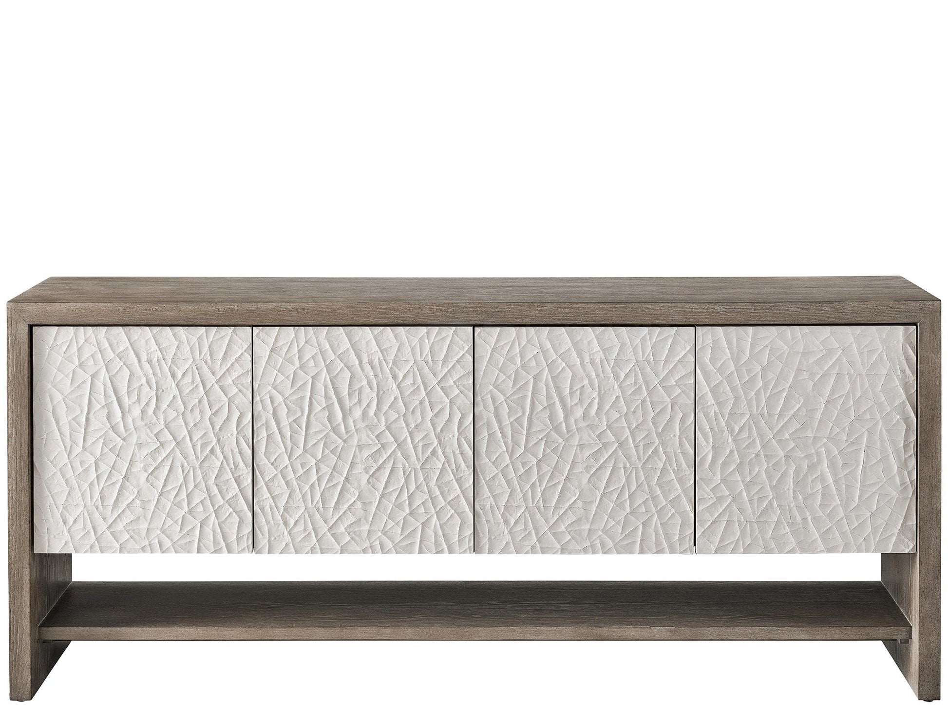 Adjustable shelves behind geometric-patterned doors offer ultimate storage flexibility.