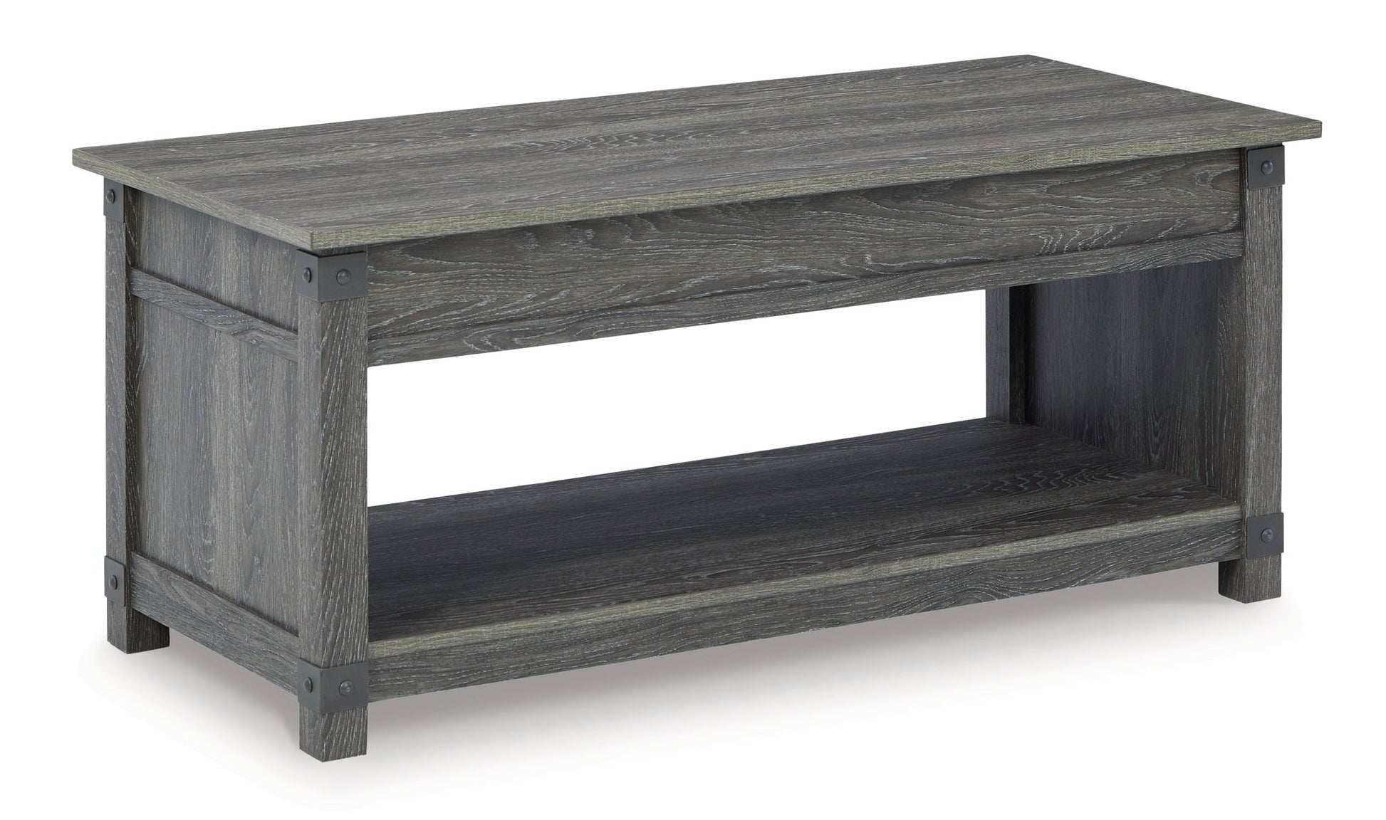 Raise the bar on modern farmhouse design with this accent table set. Sporting a grayish brown replicated wood grain effect, the coffee table's handy spring-loaded mechanism brings the tabletop closer to you. This versatile table makes it easier than ever to eat, work or play from the comfort of your sofa. A pair of coordinating end tables completes the set in style.