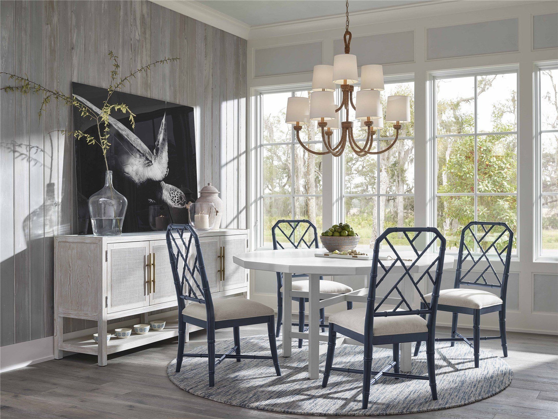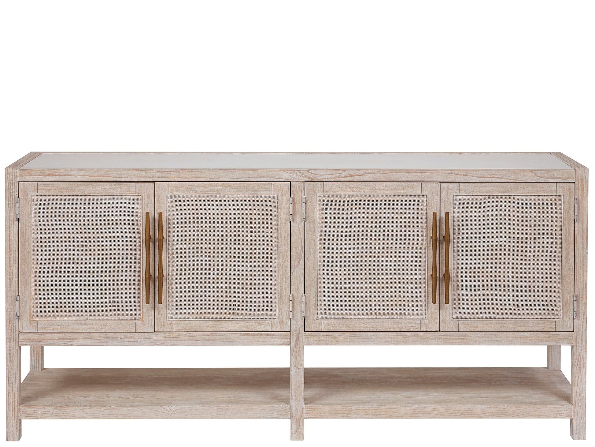 The Getaway Buffet packs a punch with lightly textured doors accented with sleek bronze hardware, open-air storage, two tray drawers and adjustable interior shelving, all finished in a serene, neutral hue.