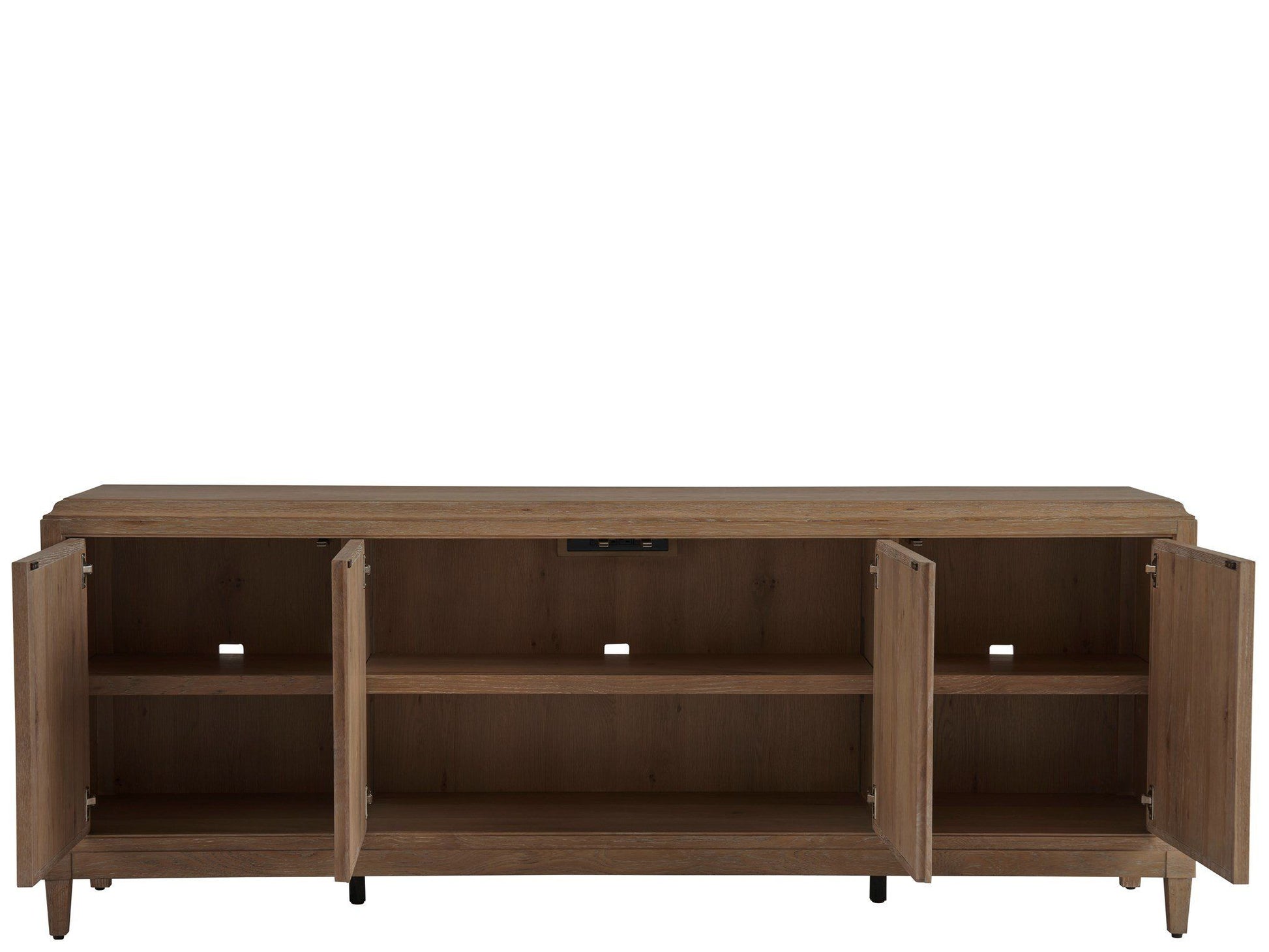 The Entertainment Credenza is a stunning blend of form and function. Its warm wood finish and intricately carved details create a sophisticated and timeless look. The ample storage space and cable management system make it a practical and stylish addition to any living