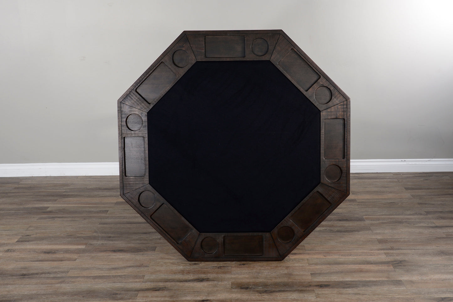 Enhance the look of your game room with this beautiful Buckskin natural finish dining poker table. The multi-functional design features a large, planked wood top for regular dining. The game side features card-friendly beige felt, cup and chip holders, with enough space to accommodate eight players.
