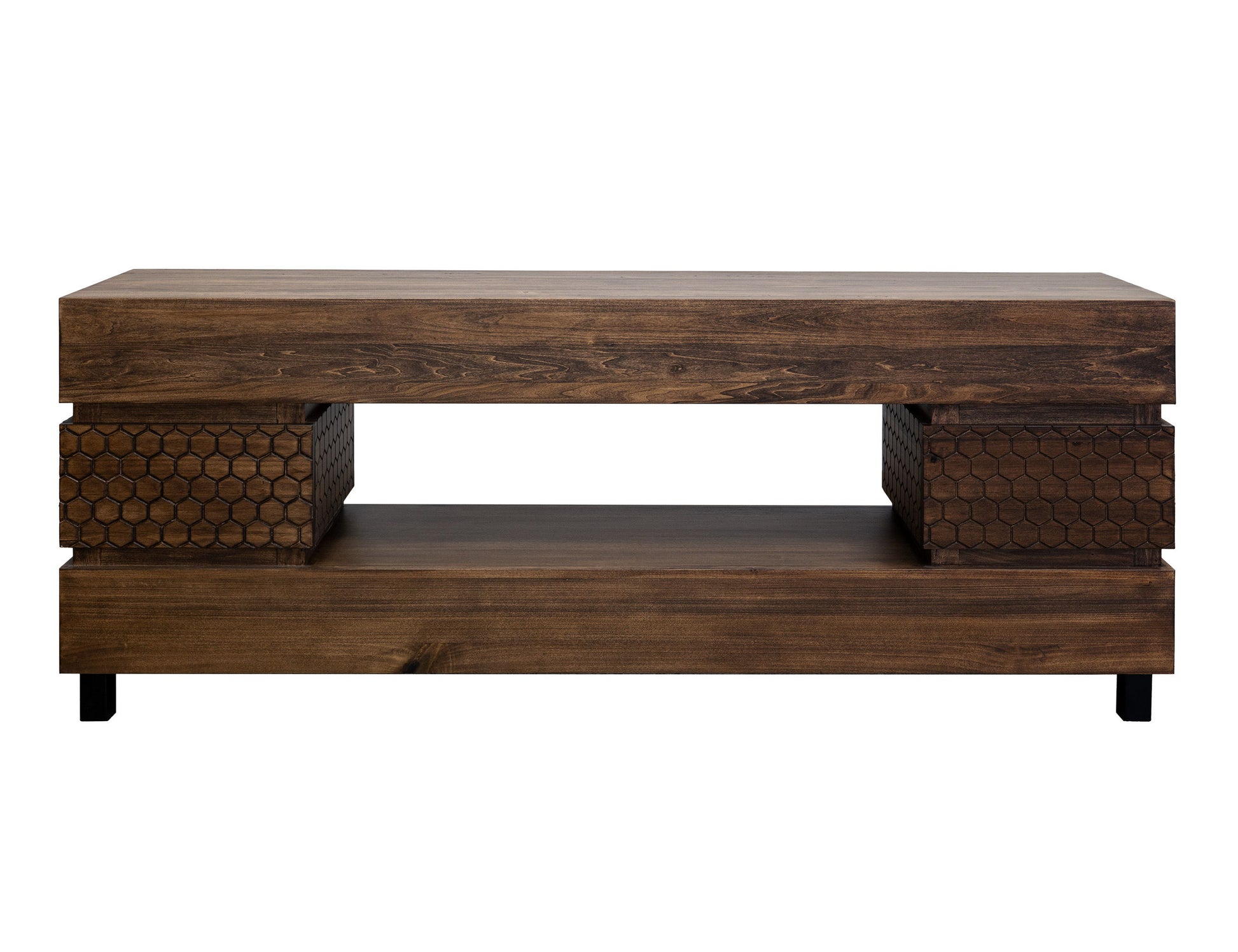 2 Drawers TV Stand. Our Honey Collection is a stunning ensemble, showcasing a rich honey brown finish adorned with intricately carved honeycomb figures. This collection effortlessly adds warmth and charm to any space, making it a captivating centerpiece for your home.