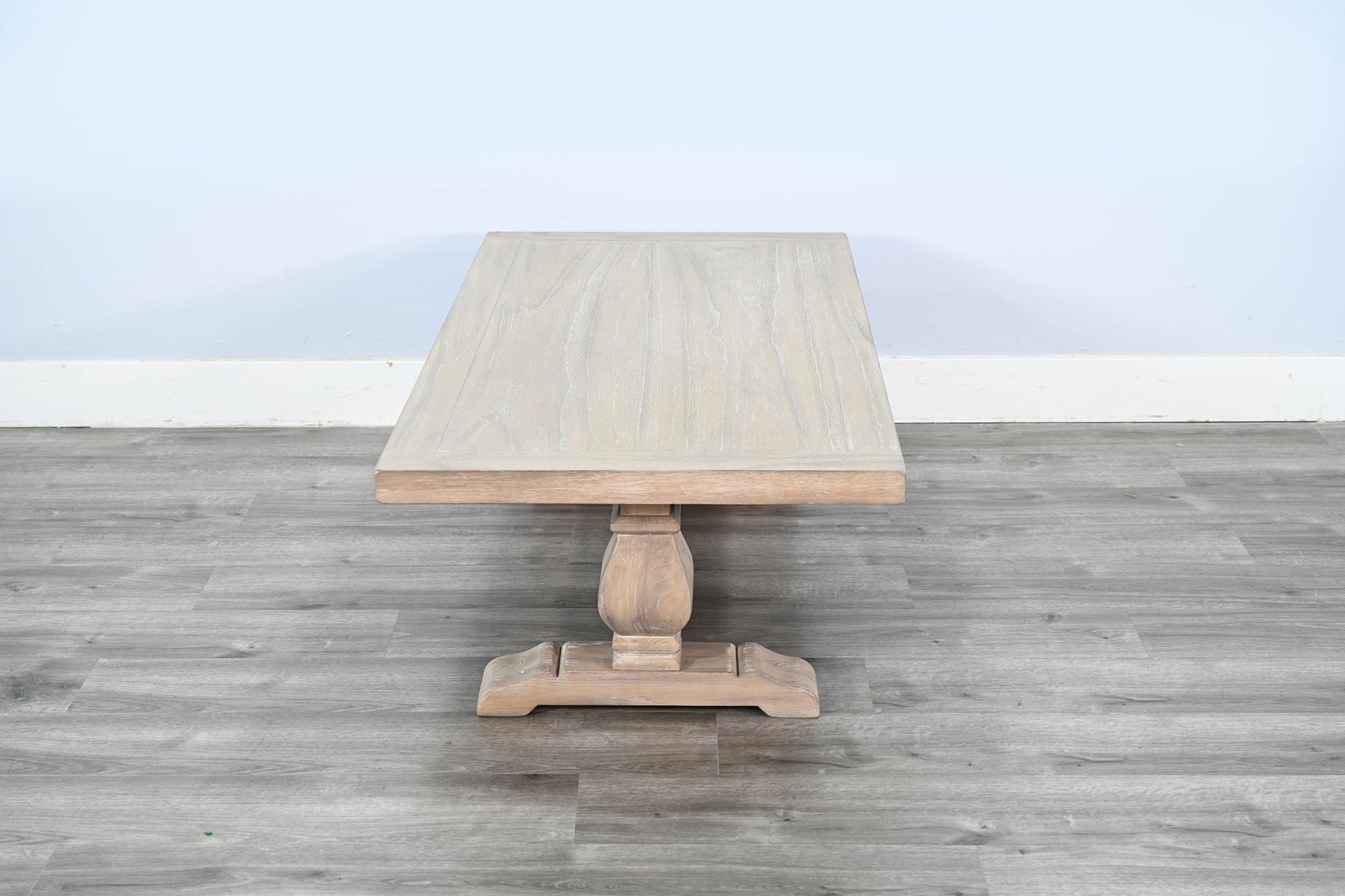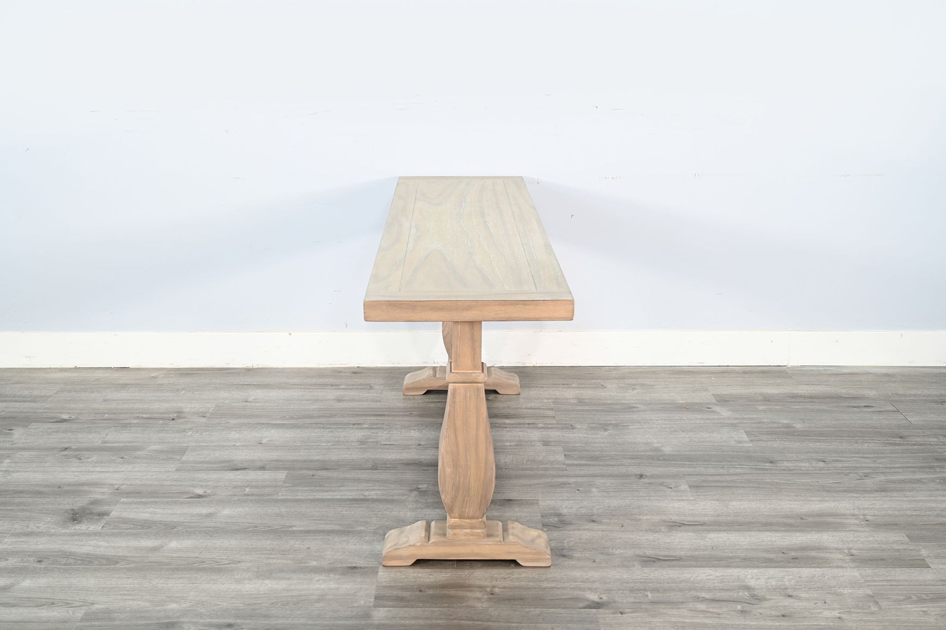 This beautifully crafted table features a timeless trestle base and a spacious rectangular top, offering both elegance and functionality to your living space. Made from solid wood with a weathered finish, it adds a rustic charm while ensuring durability. Perfect for showcasing decor or serving as a gathering spot for family and friends, this table is a versatile centerpiece for any home.