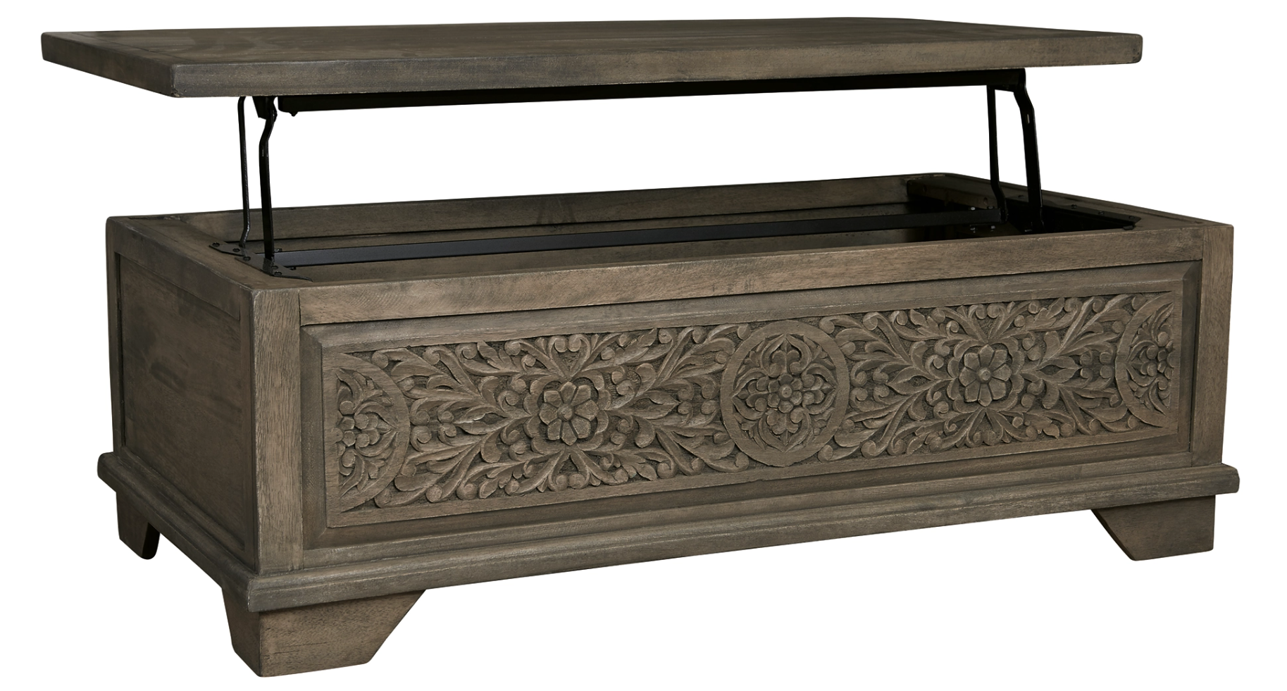 Bring that boho-chic feeling to your space with the Marcilyn coffee table. Featuring a lift top design, this piece offers functionality as well as good looks. The engraved decorative pattern lightens the solid feeling of the table. Make your room pretty and practical. Made of mango wood. Spring-lift top. Brownish gray finish.