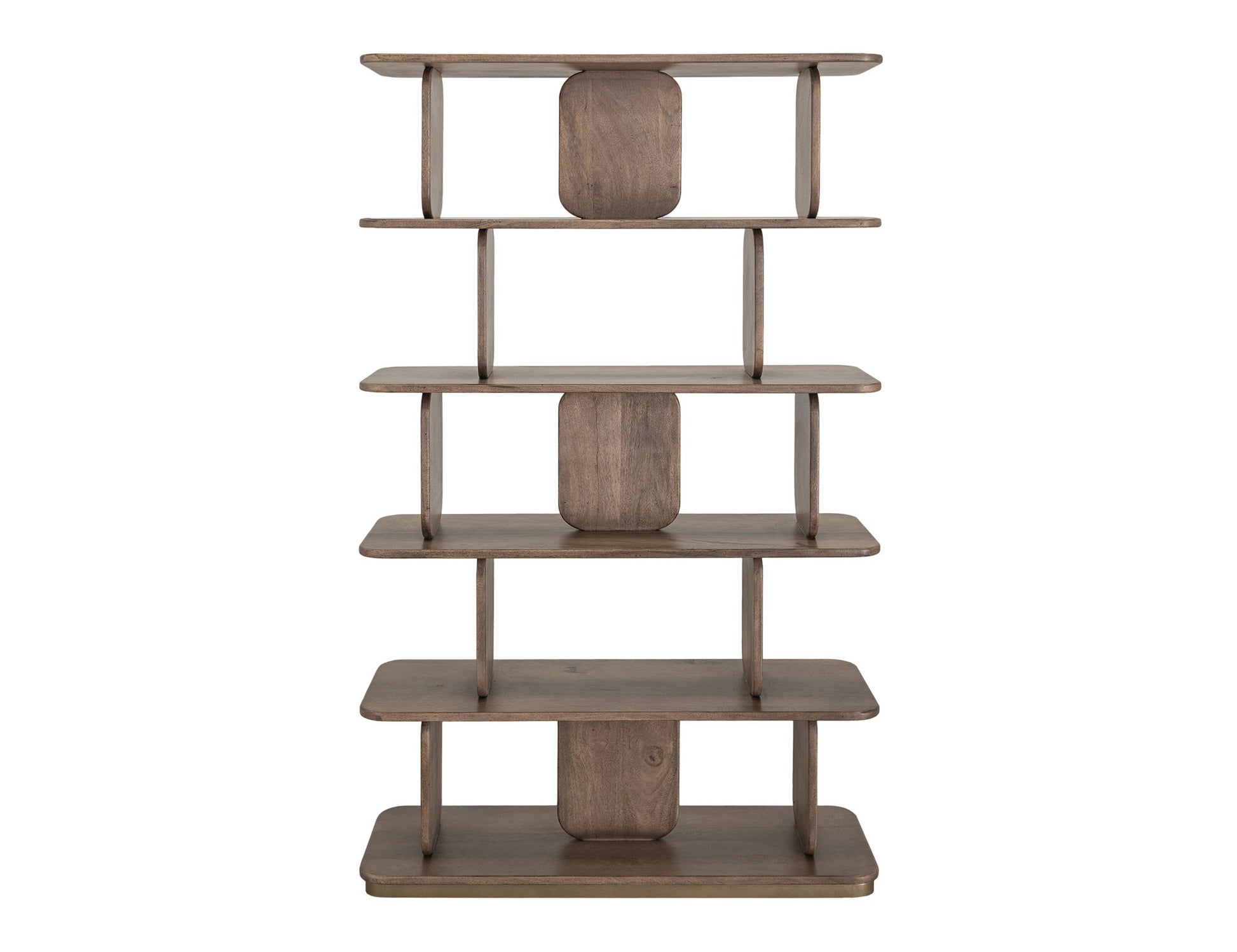 5 Shelves, Bookcase. Introducing the stunning Mezquite Bookcase: Crafted from sustainable mango wood, this exquisite collection features a lightly distressed finish that accentuates the natural beauty of the wood grain. Its unique design ensures it stands out as a captivating centerpiece in any room. With its abundant shelves and elegantly rounded panels, it effortlessly blends functionality with artistic allure. Elevate your home with the timeless charm of the Mezquite Bookcase.