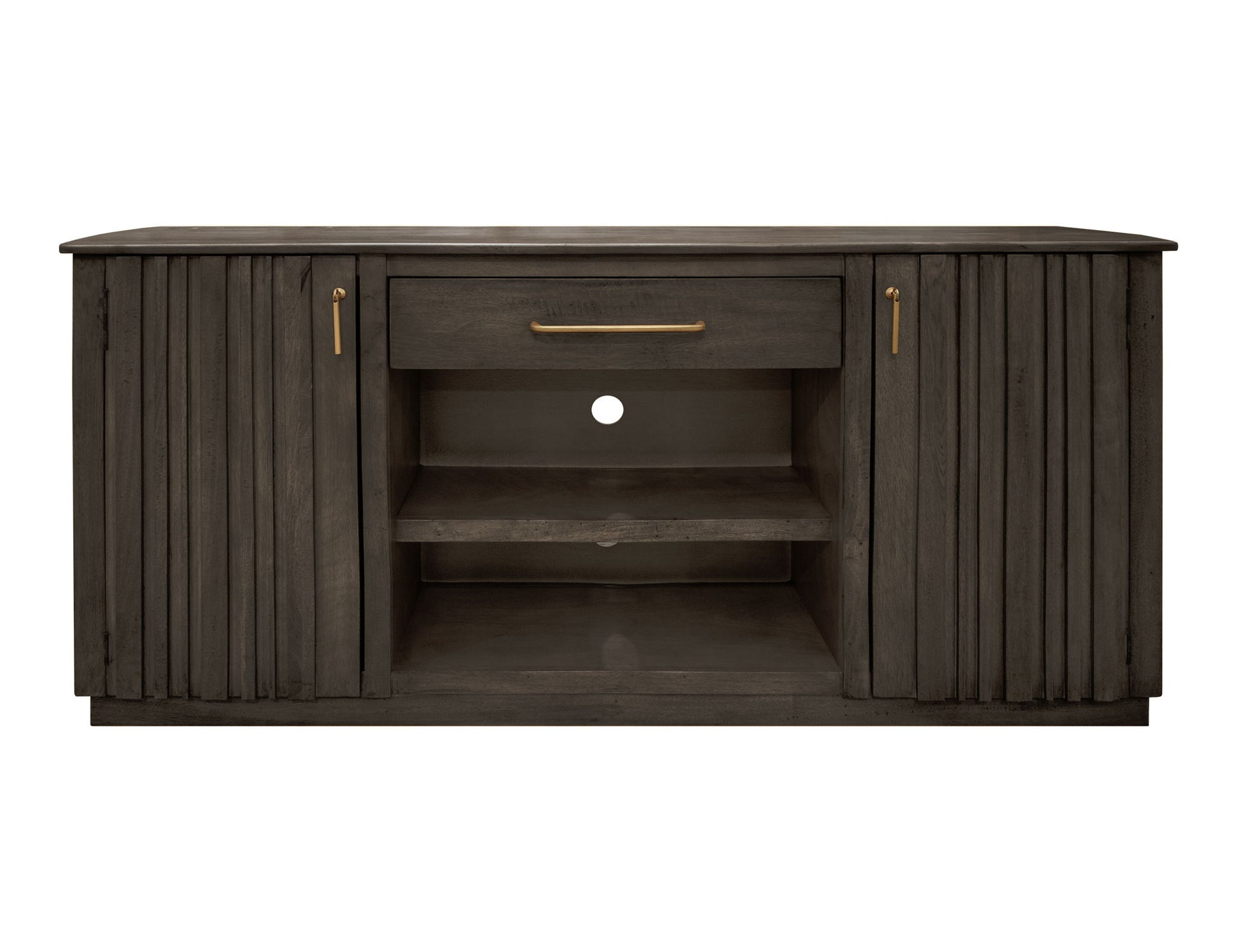 1 Drawer 2 Door TV Stand. Introducing The Dark Mezquite Collection: This exquisite collection is meticulously handcrafted from sustainable mango wood. Its light, distressed finish gracefully accentuates the natural richness of the wood grain, while its captivating, eclectic design elevates it into a true statement piece that can effortlessly enhance the ambiance of any room in your home.