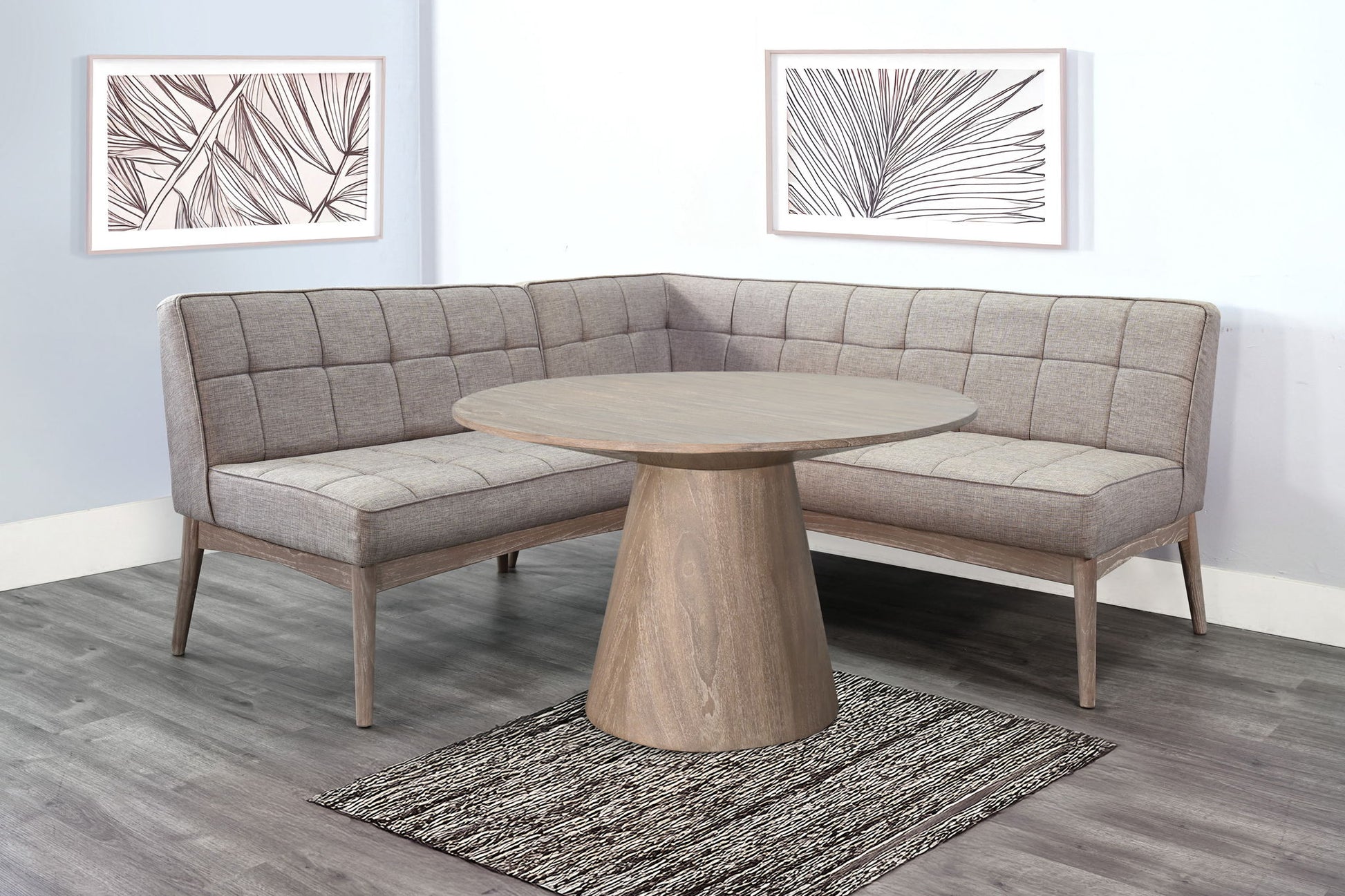 Create a cozy and stylish seating area with this mid-century modern upholstered corner dining bench. Designed to fit neatly into a corner, it maximizes seating while maintaining a sleek, airy profile. The gently angled backrest, grid-tufted upholstery, and tapered wooden legs blend comfort with timeless design. Perfect for breakfast nooks, dining rooms, or casual gathering spaces, this bench invites family and friends to linger in comfort.