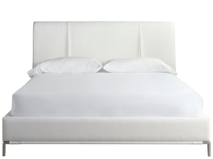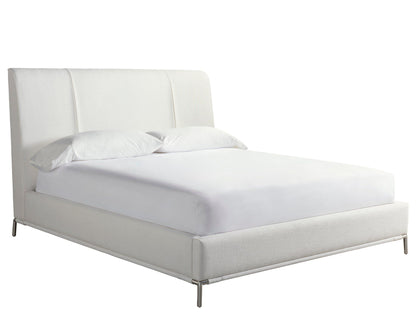 Radiating a plush opulence, the Conway Bed features a slightly curved silhouette in a clean white fabric and is finished with chic silver metal legs.