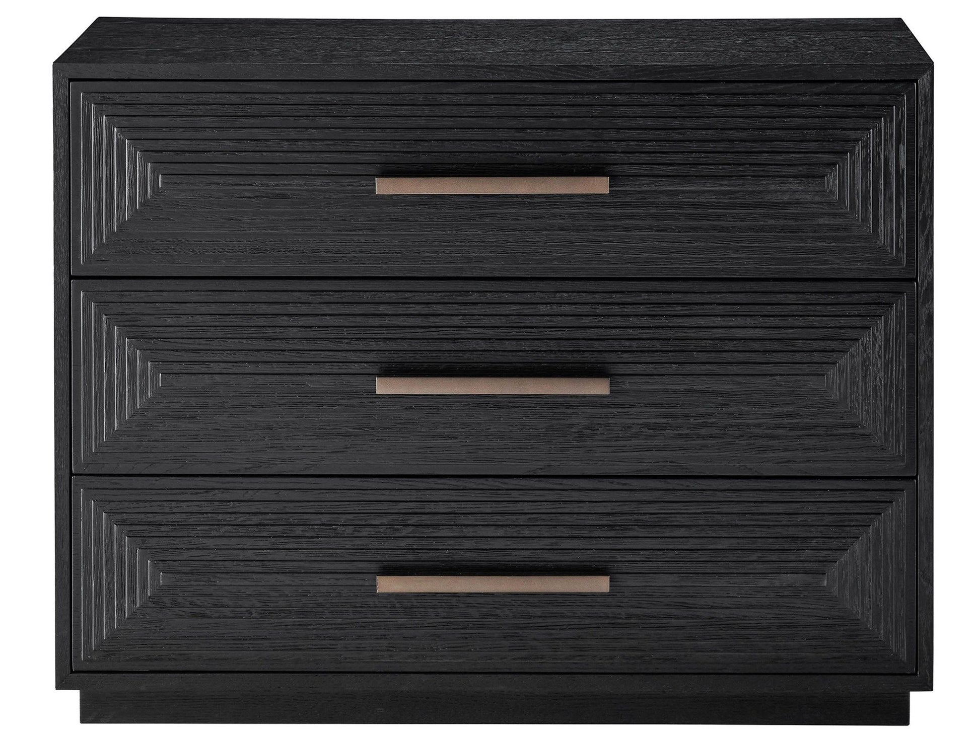 A celebration of texture, the Collins Chest is built with three spacious drawers intricately accented by a geometric carved details and sleek bar hardware. Available in a charcoal finish, it, includes an electrical outlet and two USB ports.