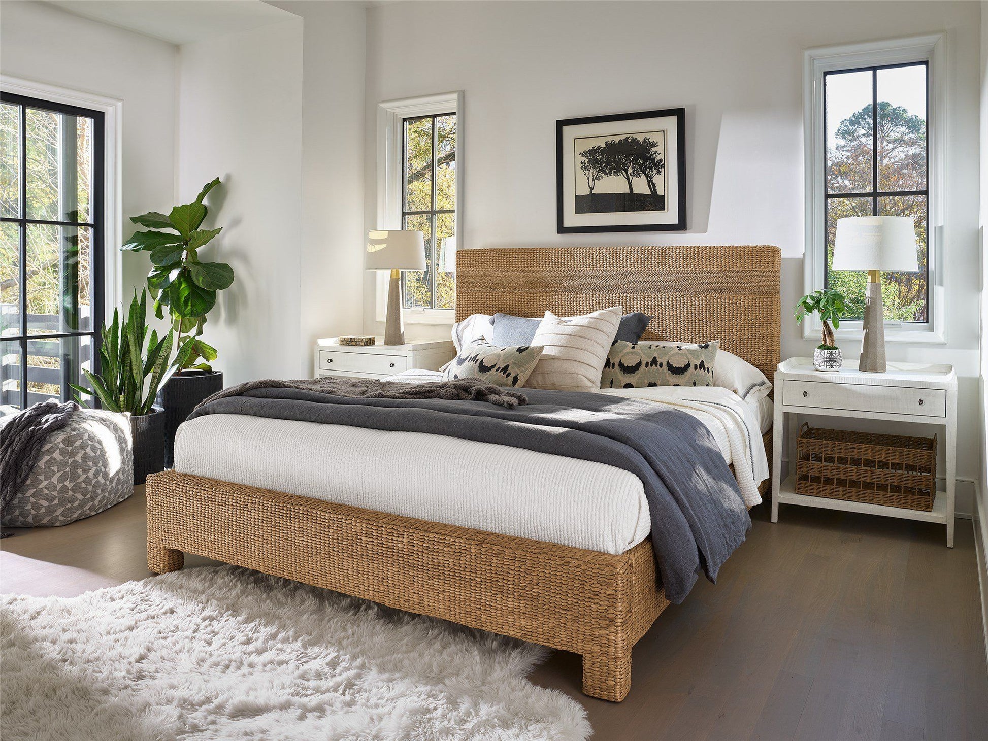 The Seaton Woven Bed is a striking bedroom statement crafted with woven water hyacinth accentuated by a delicate abaca rope band stripe.