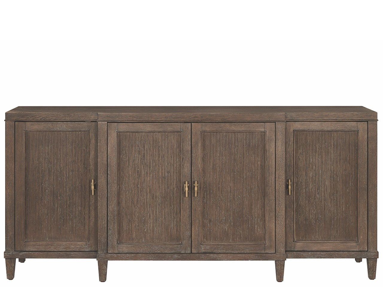 The Cocoa Credenza offers exceptional dining room storage with reeded door fronts that add textural dimension to clean aesthetic lines. This substantial piece features a felt-lined silverware tray, adjustable shelving, and integrated wire management with a power supply bar for modern functionality.