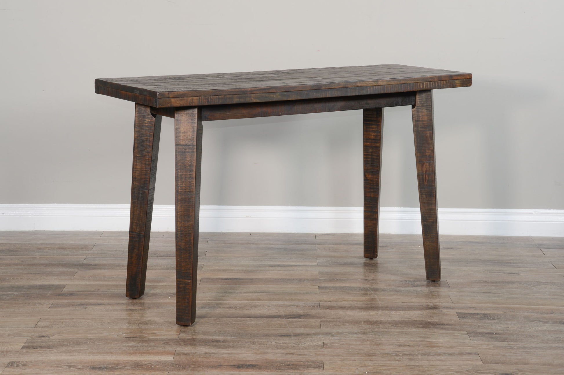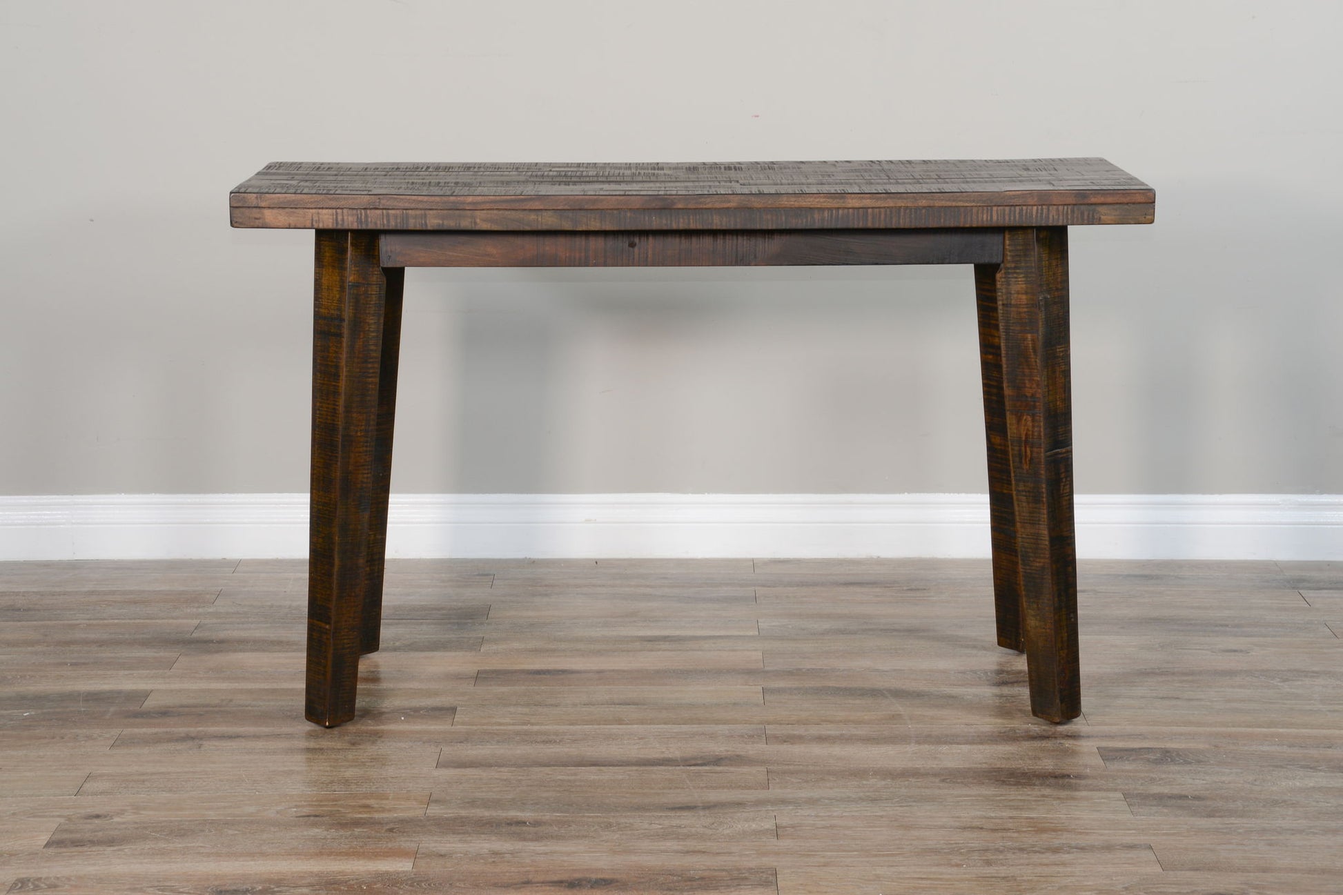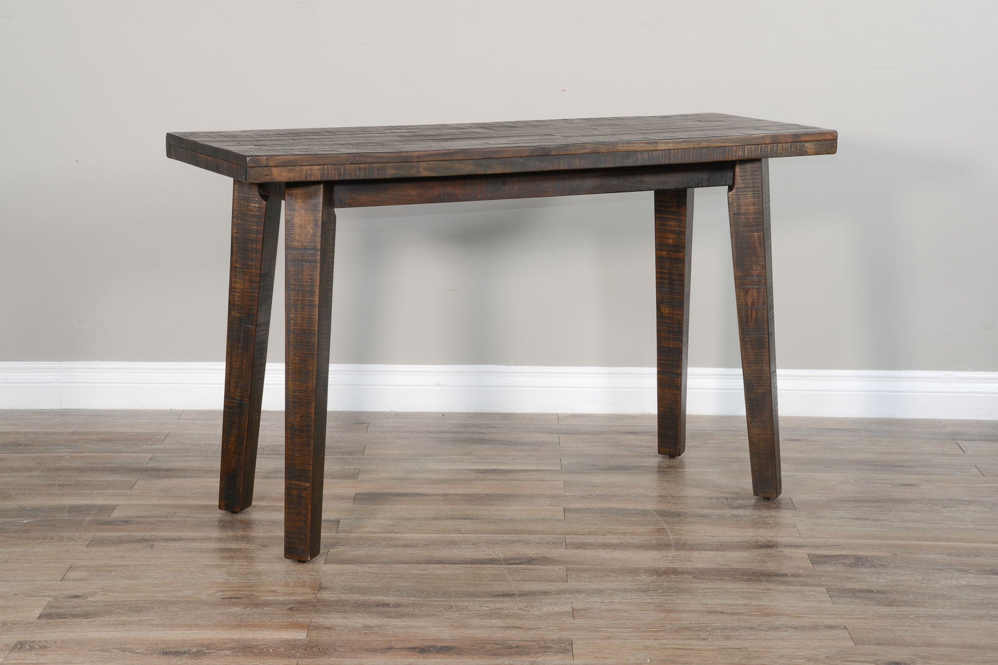 Made with rough sawn mahogany solids and veneers. This sofa table set is sleek, modern, and yet elegant. Constructed with butcher block planking, and finished in Dark Toast.