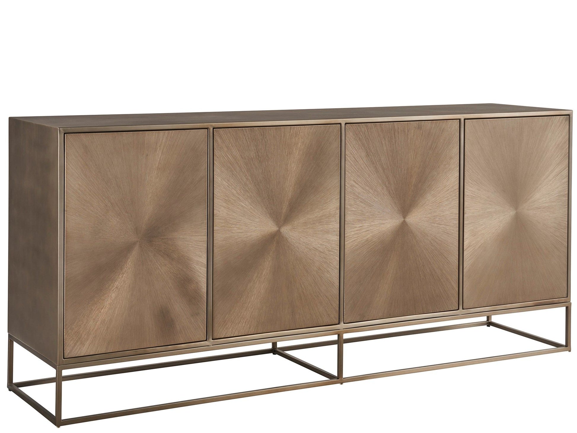 The Fusion Credenza glimmers in an Aged Brass finish, its surface catching the light with a radiant sheen. The doors, each embellished with a delicate, emanating pattern, add a layer of sophistication to the piece. With clean, precise lines framing its structure and two adjustable shelves nestled within, this credenza is a testament to elevated design, seamlessly blending functionality with a luxurious aesthetic