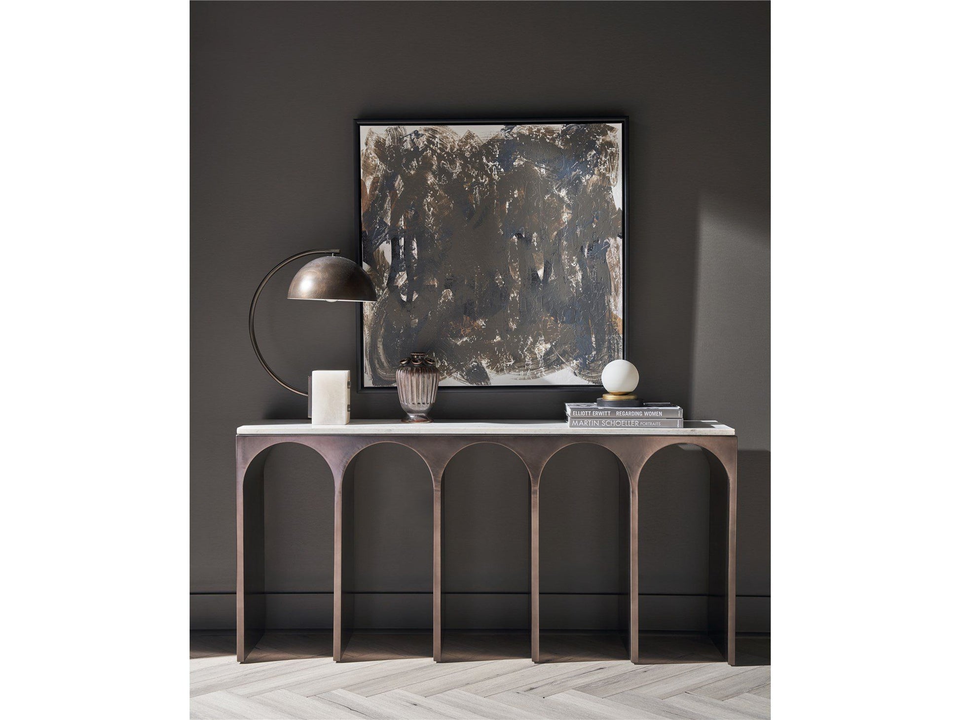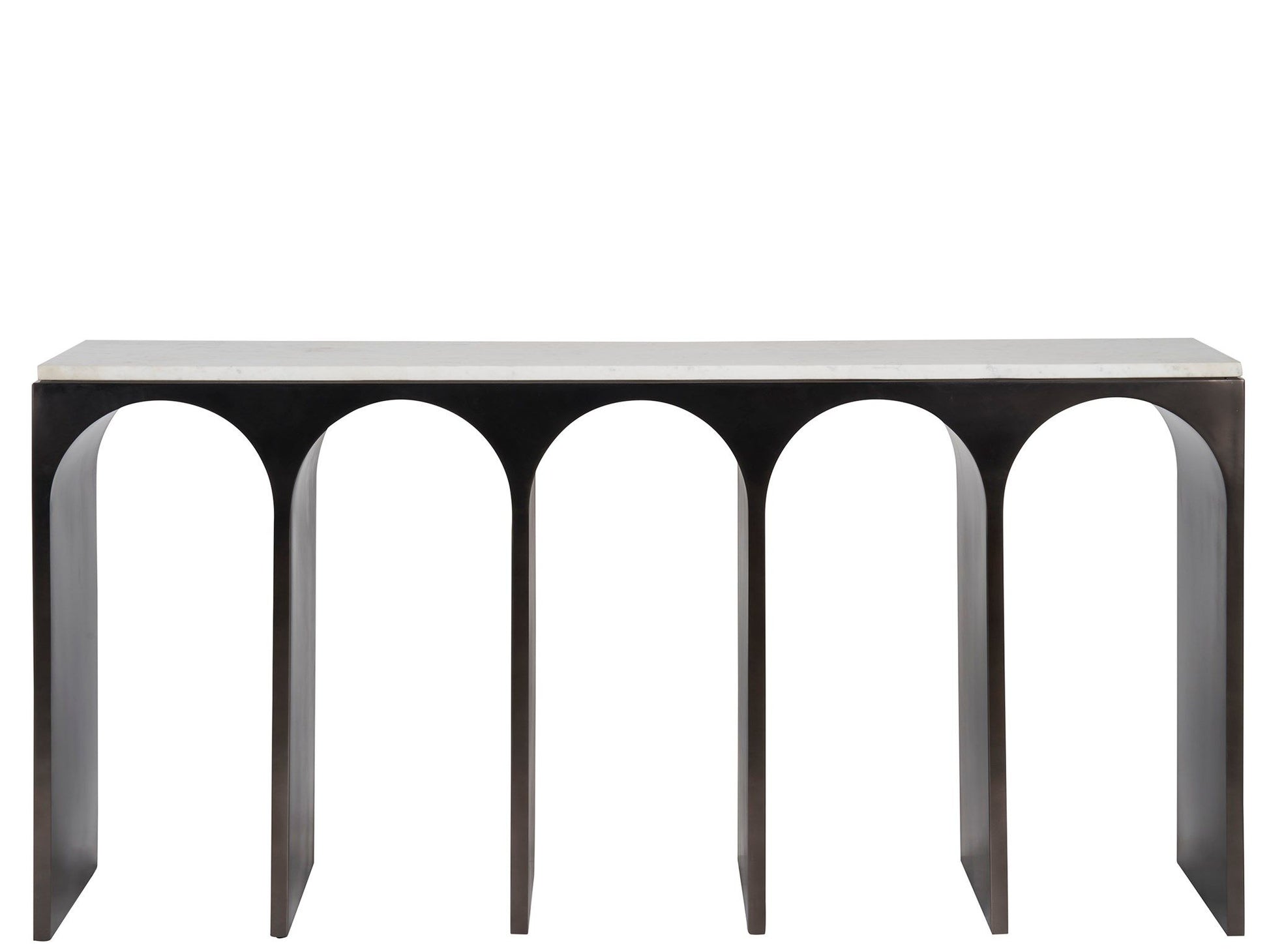 The Moda Console Table stands at the forefront of modern design, blending a sleek White Banswara top with an Aged Satin Pewter body. Its design features exaggerated curves, slender legs, and a clever interplay of negative and positive space, crafting a piece that's as visually engaging as it is elegantly functional. This table embodies contemporary sophistication, perfect for enhancing any forward-thinking interior.