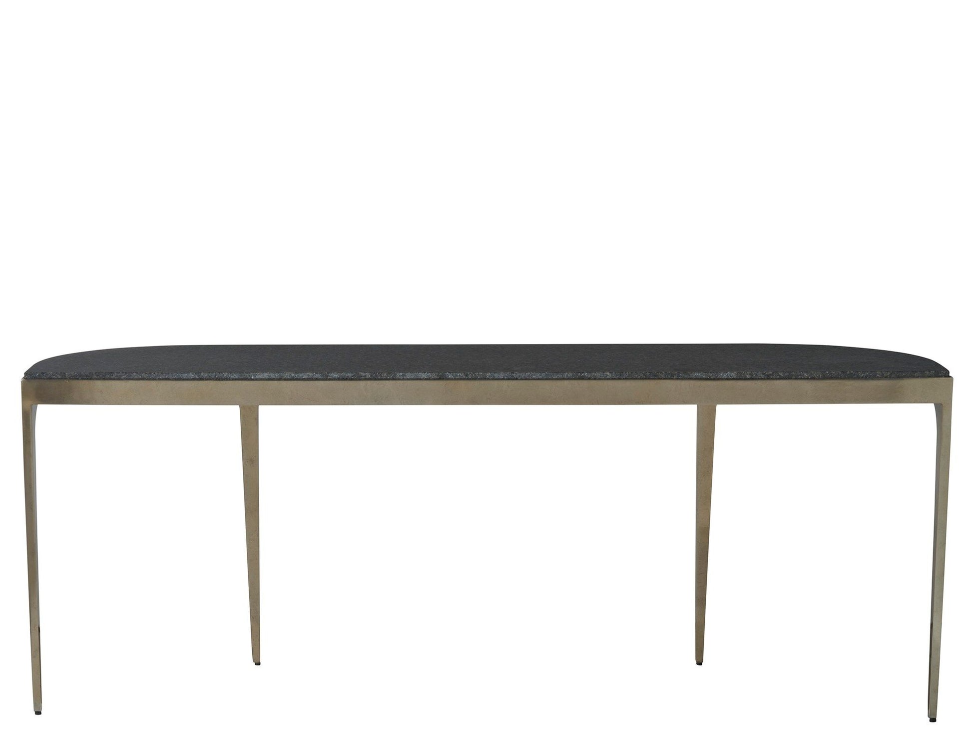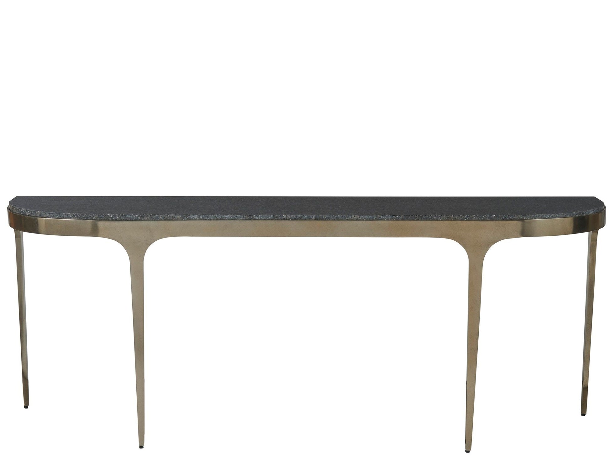 The Scarlett Console Table presents a sleek Black Granite surface, harmoniously coupled with a luminous Champagne Aluminum base. Its slim, graceful legs contribute to an aura of finesse, offering a distinguished and polished touch to contemporary spaces with its elegant blend of textures.