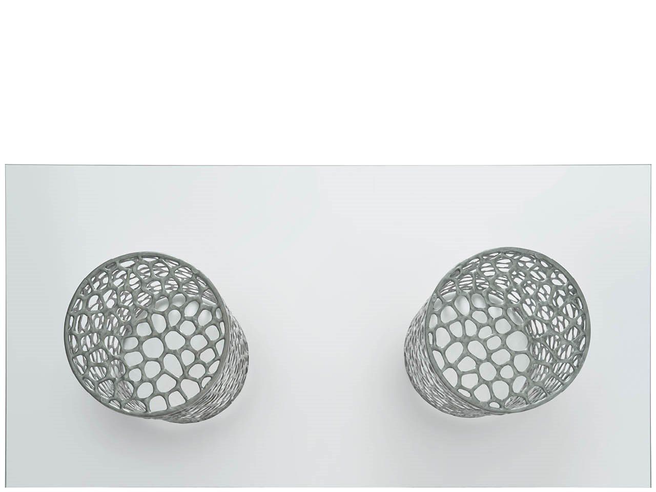 The Coral Dining Table features a rectangular glass top supported by two coral-inspired cast aluminum bases in an elegant antique nickel finish. This dining table's transparent top enhances the sculptural base creating a statement piece that embodies coastal elegance.