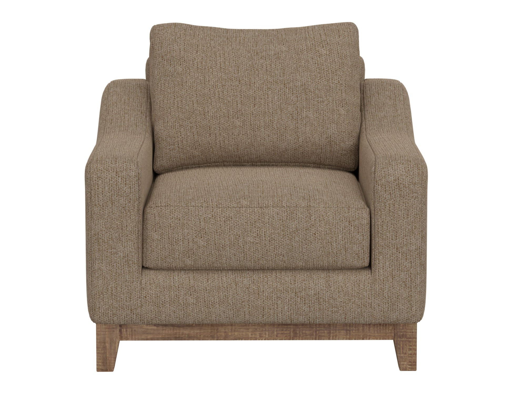 Wooden Frame & Base, Armchair. The Olivo collection seamlessly blends clean lines with a harmonious fusion of both organic and geometric shapes, offering unparalleled comfort for your space with its mid-century modern style, marked by subtle curves on padded armrests.