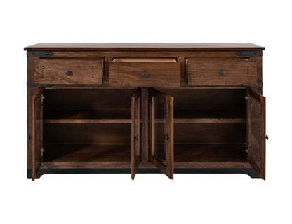 3 Drawer 4 Glass Doors 70" Console. The exceptional Parota collection features a top crafted from Parota wood, a species native to Mexico and South America. This outstanding collection is lightly hand-distressed and incorporates metal details for added elegance.