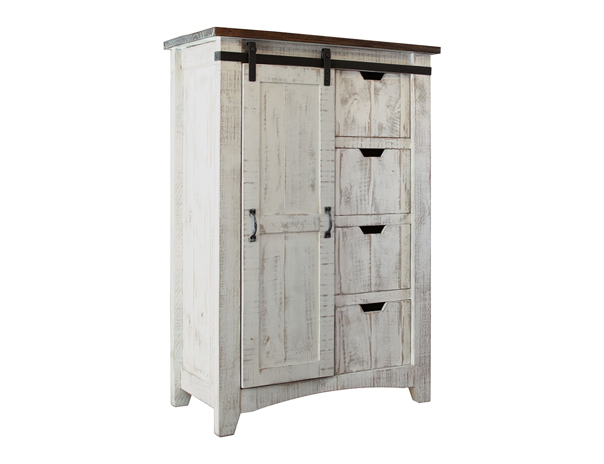 4 Drawer 1 Door Chest. Introducing our Pueblo collection, crafted from solid pine wood. This rustic collection is the perfect addition to bring your dream space to life. It features a hand-distressed finish in gray and brown on the tops.