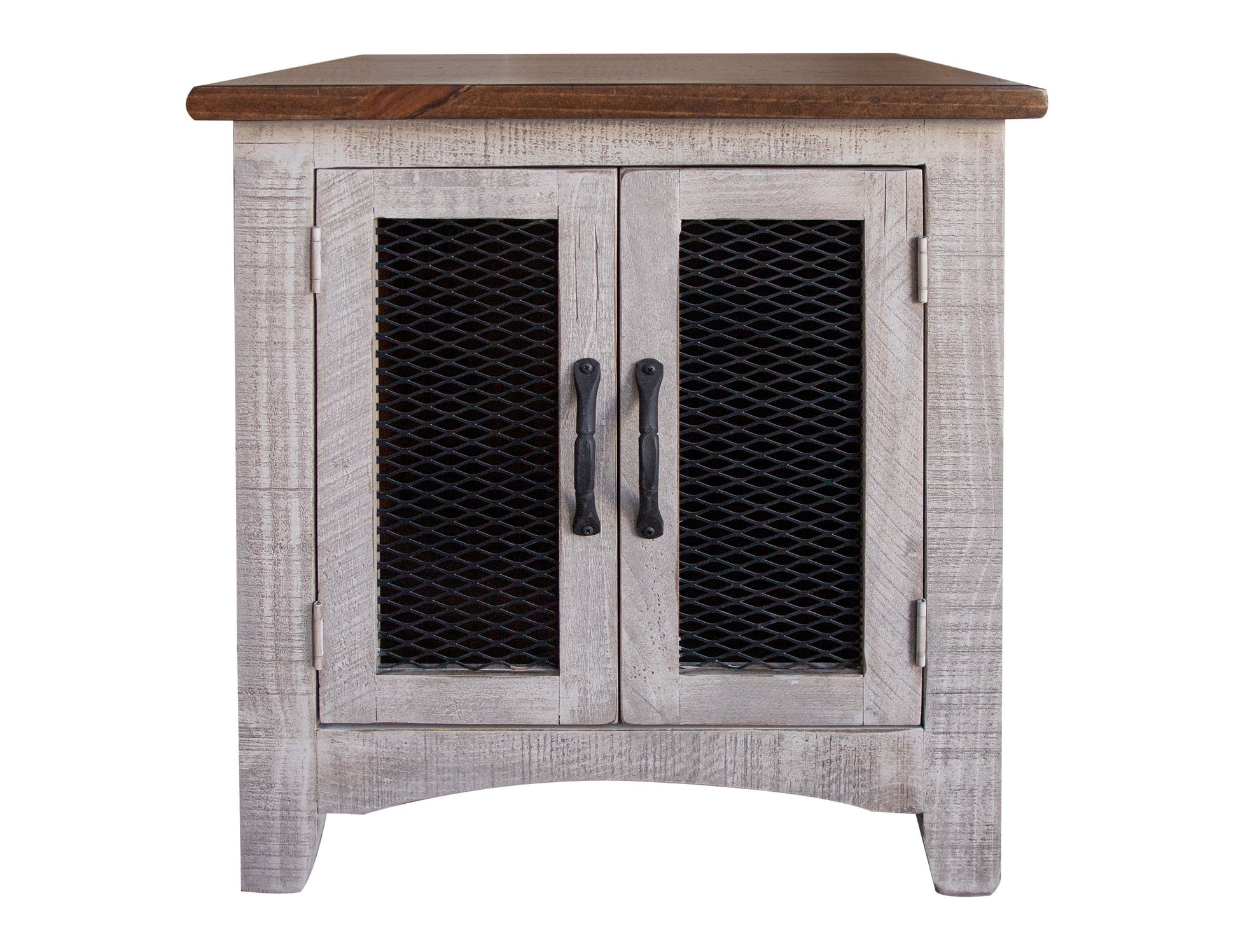 2 Metal Mesh Doors End Table. Introducing our Pueblo collection, crafted from solid pine wood. This rustic collection is the perfect addition to bring your dream space to life. It features a hand-distressed finish on the tops.
