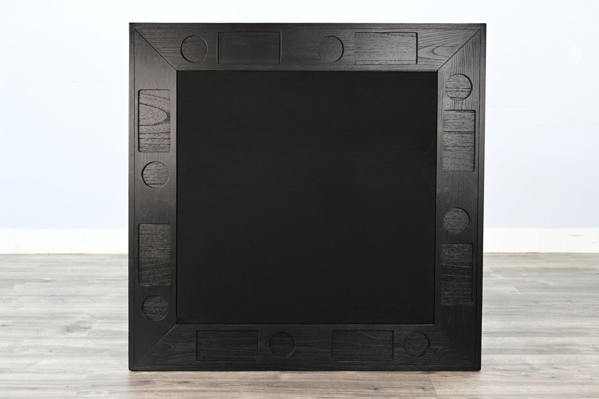 This solid wood game table in a sleek black finish features a reversible top—smooth side for dining and a recessed game surface with built-in cup holders and storage on the flip side. It stands on a sturdy trestle-style base with crossbeam support for stable gameplay. Whether hosting poker night or enjoying casual meals, it’s both functional and stylish.
