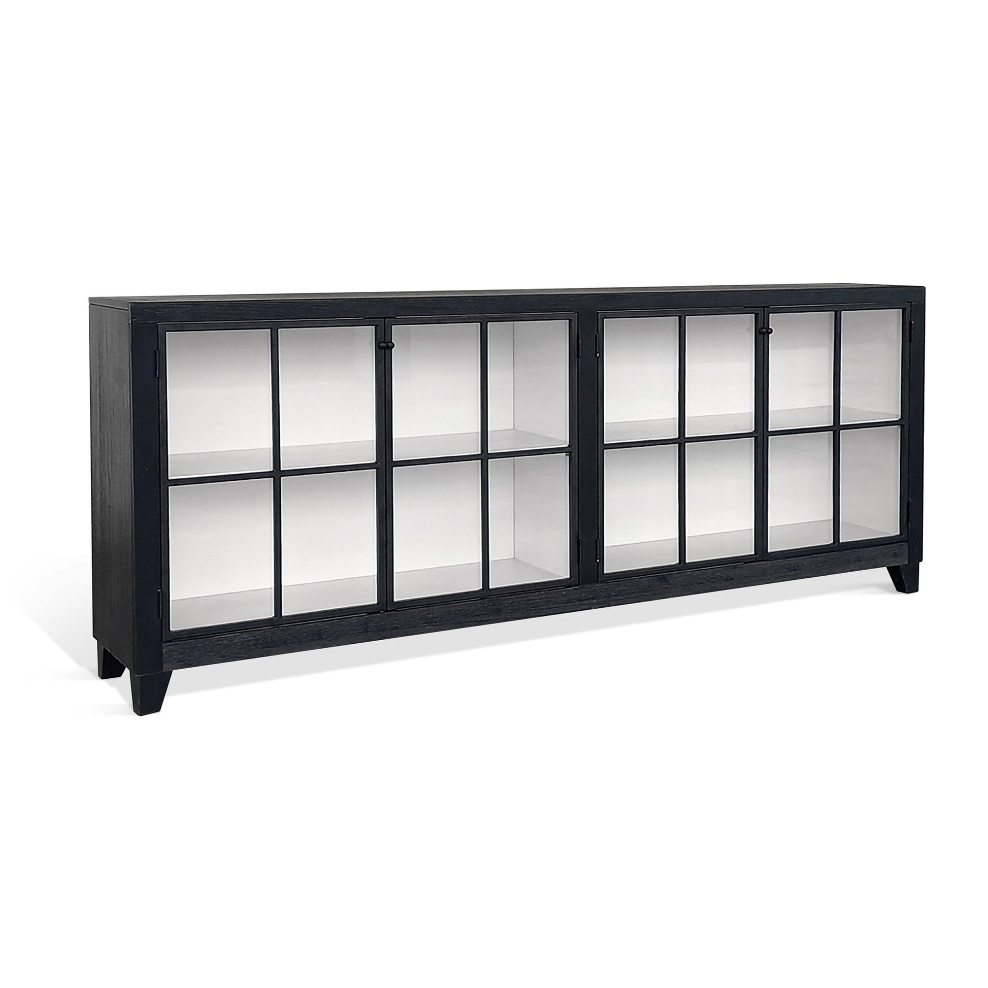 This sophisticated piece features a sleek finish and two large glass-front doors, each divided into eight panes, creating a classic and timeless look. With spacious shelving behind the glass doors, this cabinet is ideal for displaying your favorite decorative items, books, or fine china. Crafted from high-quality materials, it ensures durability and stability, making it a long-lasting addition to your home decor. The clean lines and black finish make it a versatile piece that can complement various interior styles, from modern to traditional.