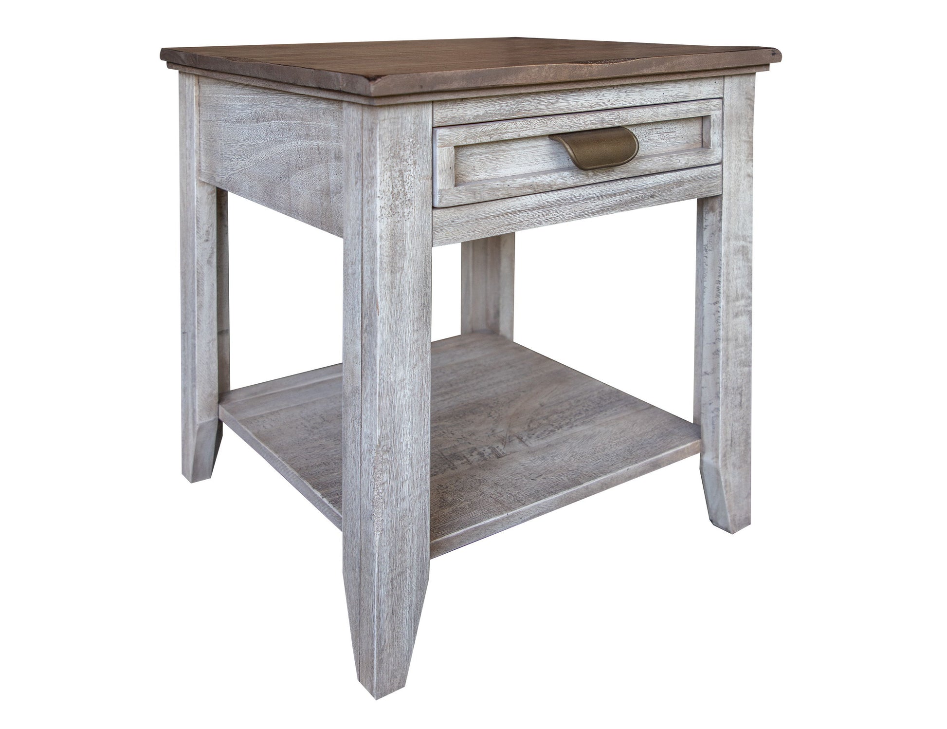 1 Drawer End Table. Introducing Sahara, an organic modern collection designed to transform your space into a tranquil and neutral haven. Crafted from sustainably sourced, lightly distressed mango wood, this stunning minimalistic collection effortlessly blends style and sustainability, making it a perfect fit for any space.