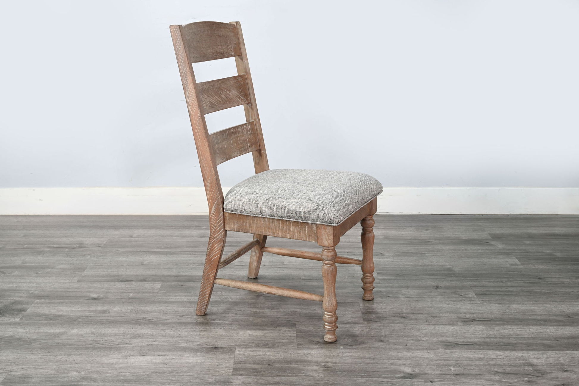 Classic charm meets everyday comfort in this rustic ladder back dining chair. Crafted from solid wood with turned legs and a distressed finish, it adds vintage appeal to any dining room. The padded seat is upholstered in a textured fabric that offers a cozy place to sit for family meals or gatherings.