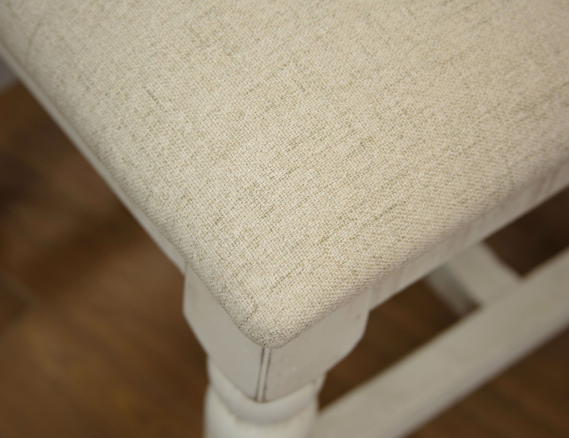 Upholstered Seat Wooden Chair. No table is complete without its companion chairs. Featuring a ladder back and turned legs, this chair adds the subtle detail to compliment whatever dining table it sits beside. A comfortable fabric seat will allow you to have a comfortable place to relax and enjoy a nice meal after a long day at work.