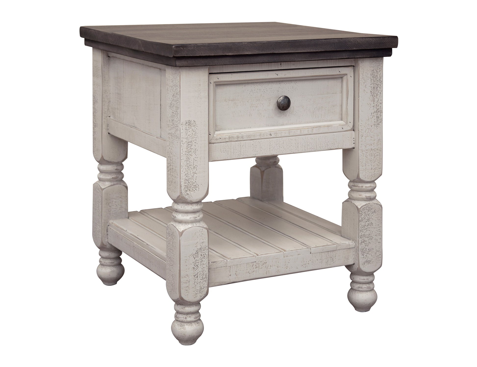 1 Drawer End Table. Exuding farmhouse chic with just the right touch of old-world charm, the Stone Collection is meticulously crafted from solid pine wood. The wood is lightly distressed, showcasing a white finish and complemented by weathered gray tops.