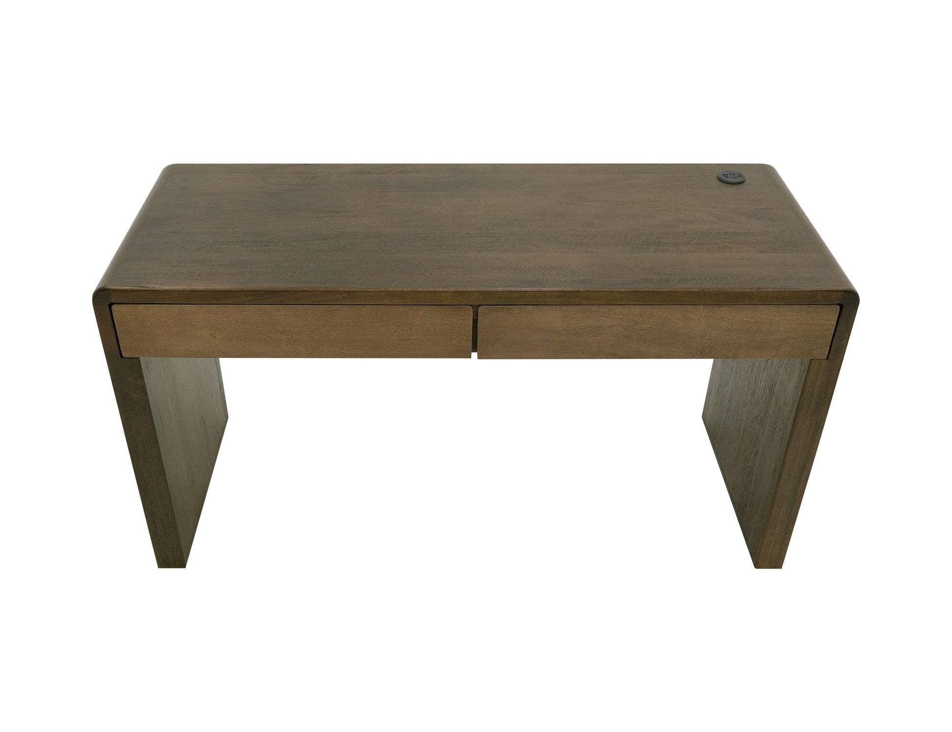 2 Drawer, Desk. Introducing the Tamesis Desk, a blend of modern design and practicality for your workspace. This minimalist desk features clean, sleek lines and is expertly crafted from sustainably sourced mango and melina wood. Its elegant multi-step lacquer finish showcases a beautiful interplay of light brown and chocolate brown tones, enhancing the wood's natural grain. The Tamesis Desk has a spacious rectangular top with rounded edges, combining modern style with comfort. It features a circular grommet with a power outlet and USB C port for added convenience. It includes two well-sized drawers for ample storage, helping you maintain an organized workspace. With solid wooden legs and sturdy construction, this desk is a durable addition to your office. The Tamesis Desk combines elegant aesthetics with practical features, making it ideal for working from home or setting up a stylish office. Its sophisticated design and functionality enhance productivity and workspace ambiance.