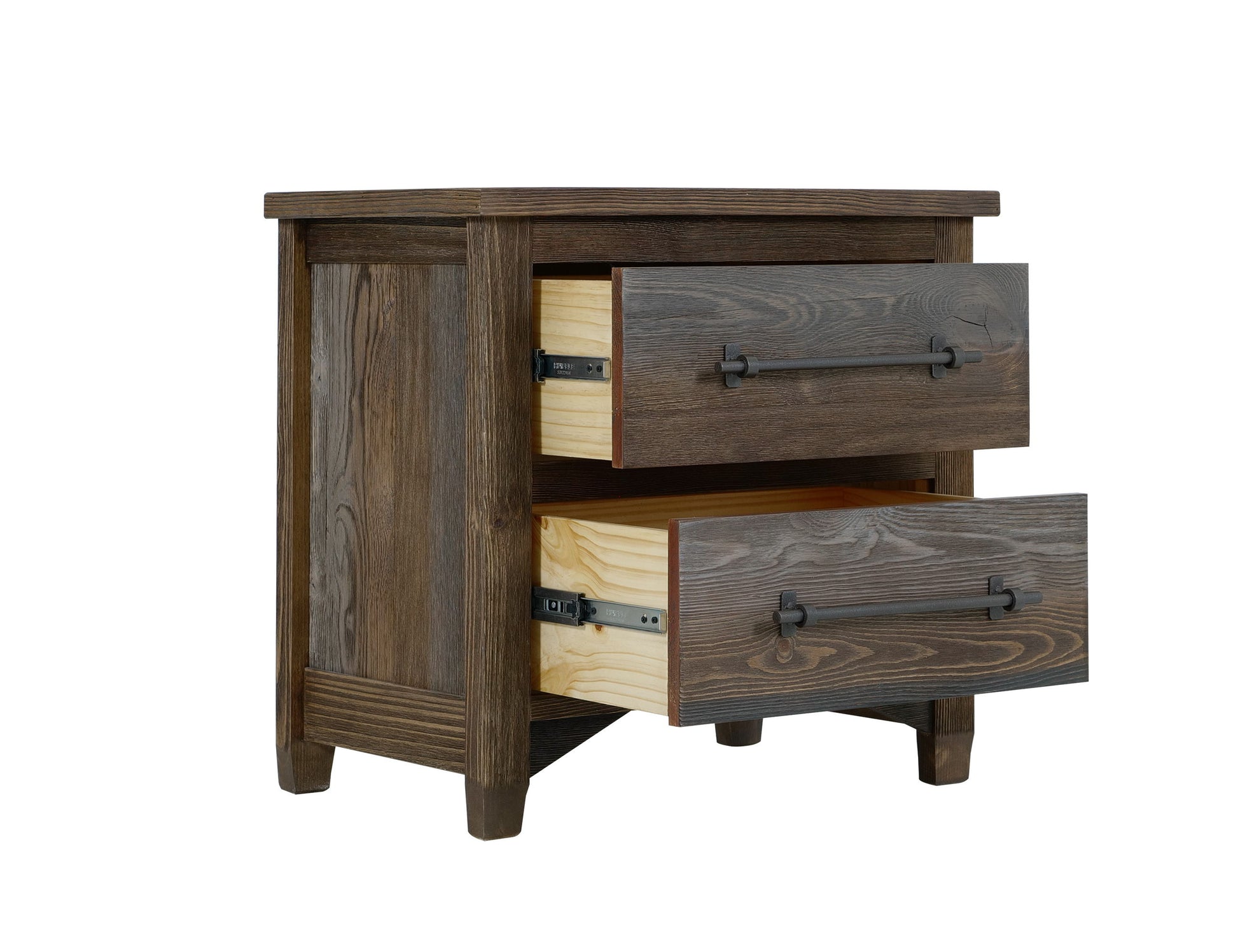 2 Drawer, Nightstand. Elevate your bedroom environment with the Town collection, a beautiful blend of rustic style and modern sophistication. Each piece features a multi-step lacquer finish that highlights rich brown and gray tones, enhancing the wood's natural beauty. Crafted from pine and poplar, this collection boasts a wire-brushed wood texture for added character. This beautifully designed bedroom set will transform your space and leave a lasting impression. make The nightstand offers ample storage with two spacious drawers. Iron center handle pulls add an industrial touch, beautifully contrasting with the warm design.
