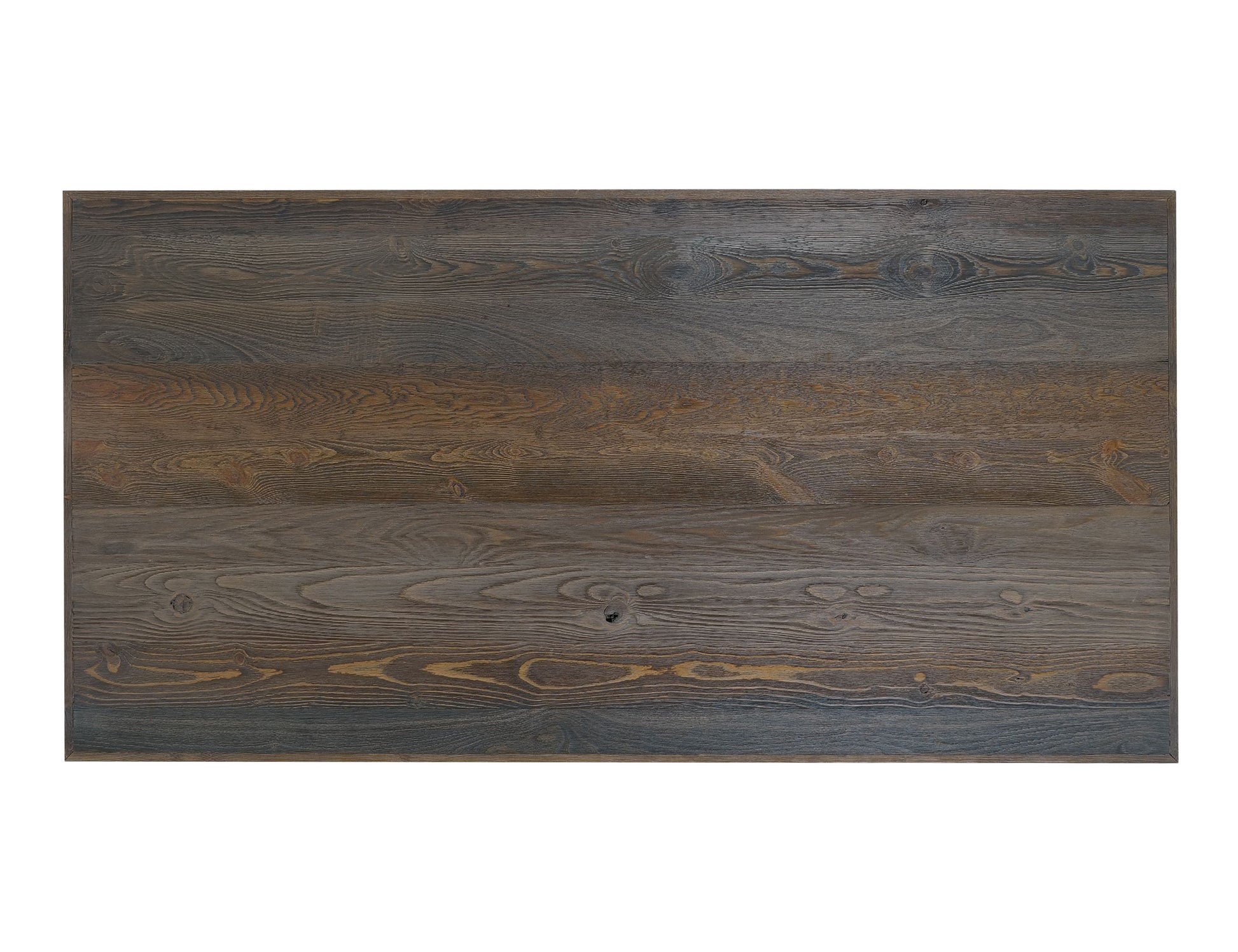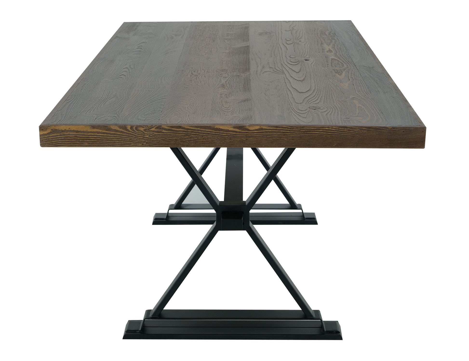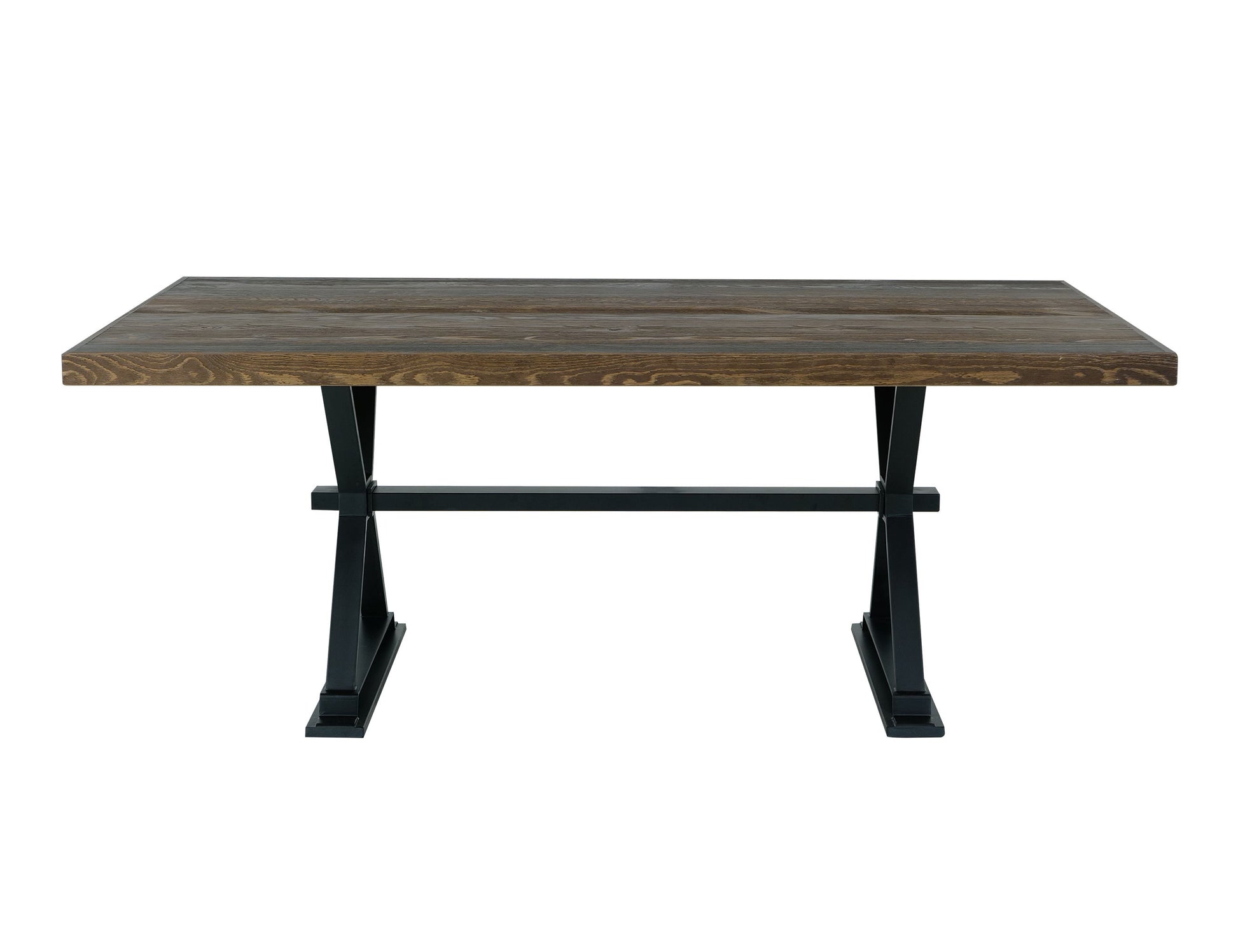 Trestle Dining Table. Elevate your dining experience with the Town Dining Collection, a perfect blend of rustic charm and modern elegance. This table features a beautifully crafted pine and poplar wood tabletop with a wire-brushed finish, adding texture and character. The sturdy metal base with a powder-coated matte finish ensures durability. The rustic wooden top and the elegant trestle metal base make this table both functional and stylish. Experience the timeless beauty and exceptional craftsmanship of the Town collection's Dining set and let it become the centerpiece of your dining room.