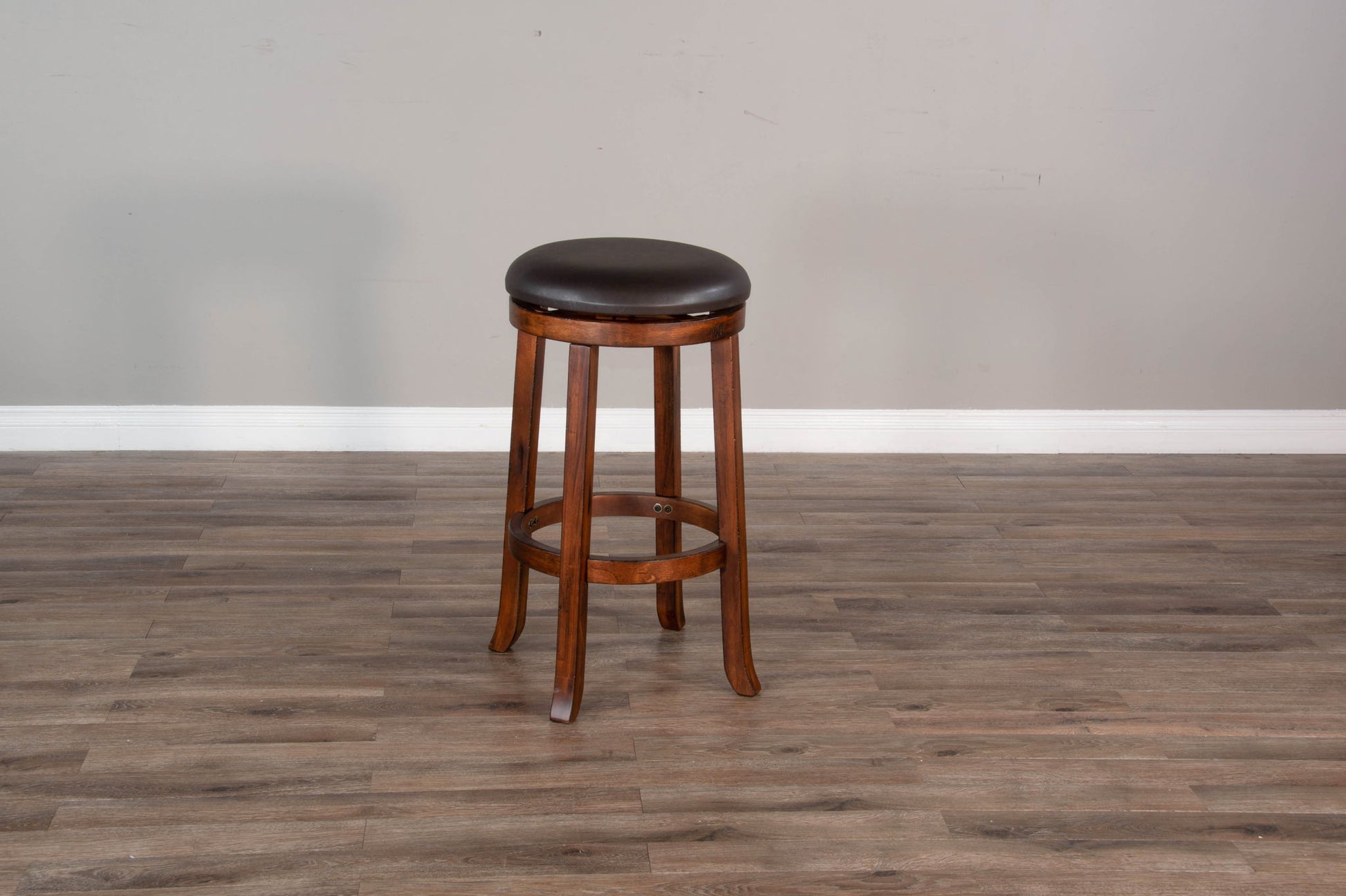 The Backless Swivel Stool features a simple design of vinyl upholstery seat and wooden base. Swivel functionality makes it easy to see what's going on around you while its backless design ensures it can be tucked under for a clean aesthetic.
