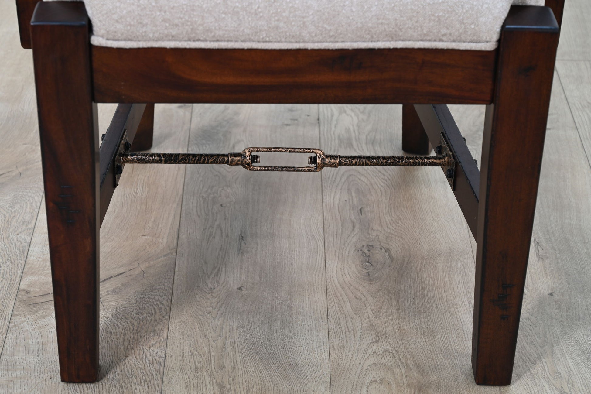 Indulge in rustic charm and enduring comfort with our ladderback Wood Dining Chair. Meticulously constructed with distressed mahogany solids, this sturdy chair exudes timeless appeal. The addition of turnbuckle accents imparts a rustic touch, elevating its design with a nod to vintage craftsmanship. Crafted from plantation-grown wood, the chair seamlessly blends eco-consciousness with durability. The powder-coated metal components ensure lasting strength and stability, adding an industrial edge to the overall aesthetic. Complete with a plush cushion upholstered in a poly-cotton fabric.